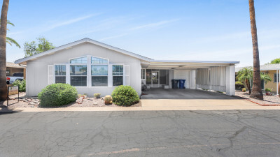 Spacious 1,708 sq. ft. Cavco with 2 beds, 2 baths, small office/den, screened AZ room AND SIDE BY SIDE PARKING! Features laminate flooring, open great room, island kitchen with cooktop, breakfast bar, and extra cabinets. Master bath has tiled, handicap-accessible shower and dual sinks. Updates: New roof (2023), new A/C & heat (2025), new plumbing (2024), new awning (2023). Dual pane windows, ceiling fans, and tape/textured walls throughout. Shed includes washer/dryer and golf cart door. Don’t miss this move-in ready gem!  Call to schedule your personal tour today!  (480) 325-1161