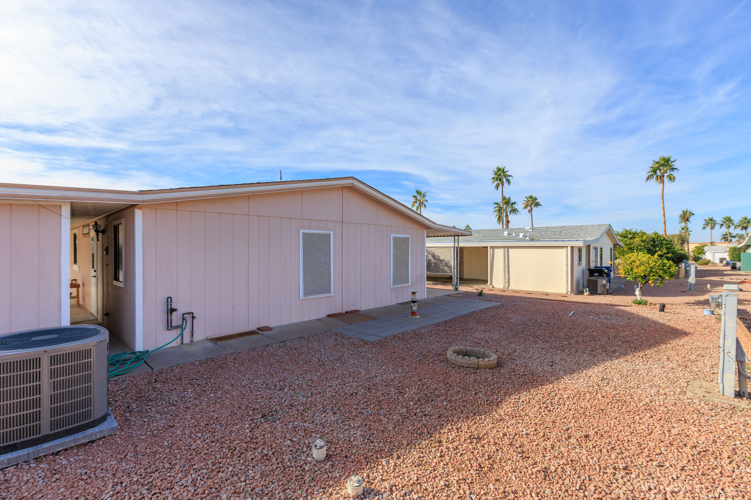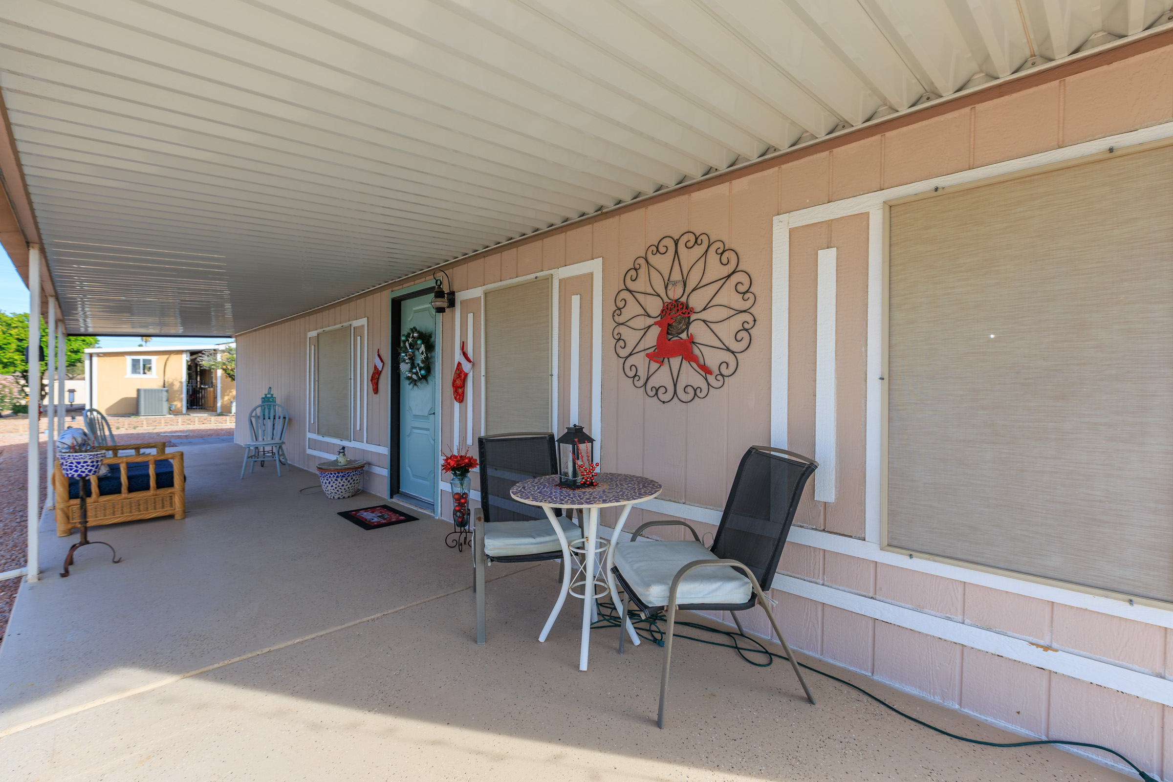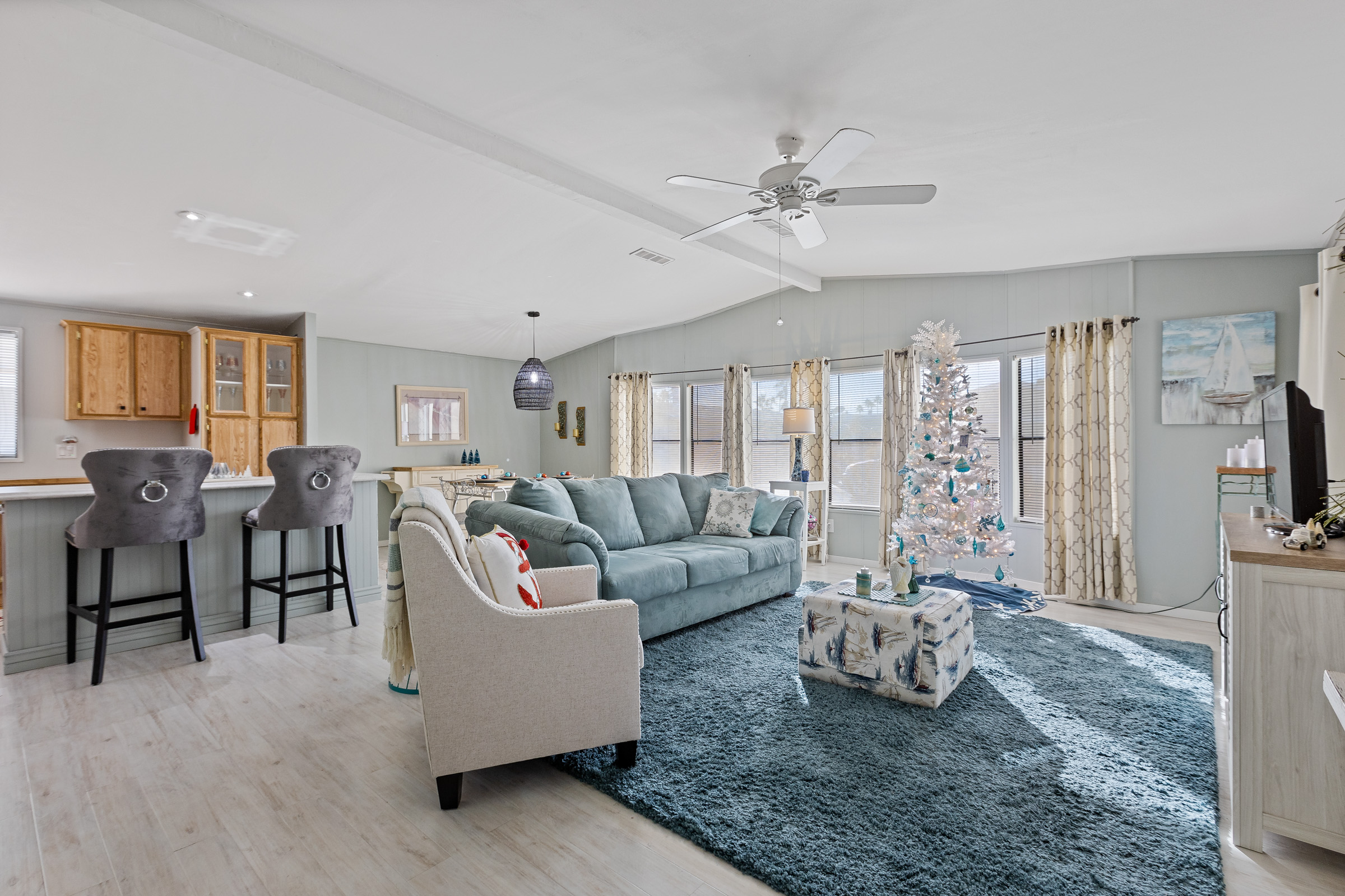 Charming 2-bedroom, 2-bath home offering 1,248 sq. ft. of stylish, comfortable living in a bright coastal-inspired setting. The open-concept floor plan is perfect for both everyday living and entertaining, featuring a spacious kitchen with a center island and breakfast bar that flows seamlessly into the living and dining areas. Coastal color palettes and durable laminate flooring create a light, airy feel throughout the home. The private primary suite includes a double-seated step-in shower, while the guest bathroom features a tub/shower combo and a brand-new vanity, providing comfort and convenience for visitors. Enjoy peace of mind with major updates already completed, including a new roof (2024), new awnings (2024), A/C (2019), and furnace (2019). Outdoor living is enhanced by a patio with epoxy coating, perfect for relaxing or entertaining, along with a storage shed for added functionality. Call to schedule your personal tour today! (480) 325-1161