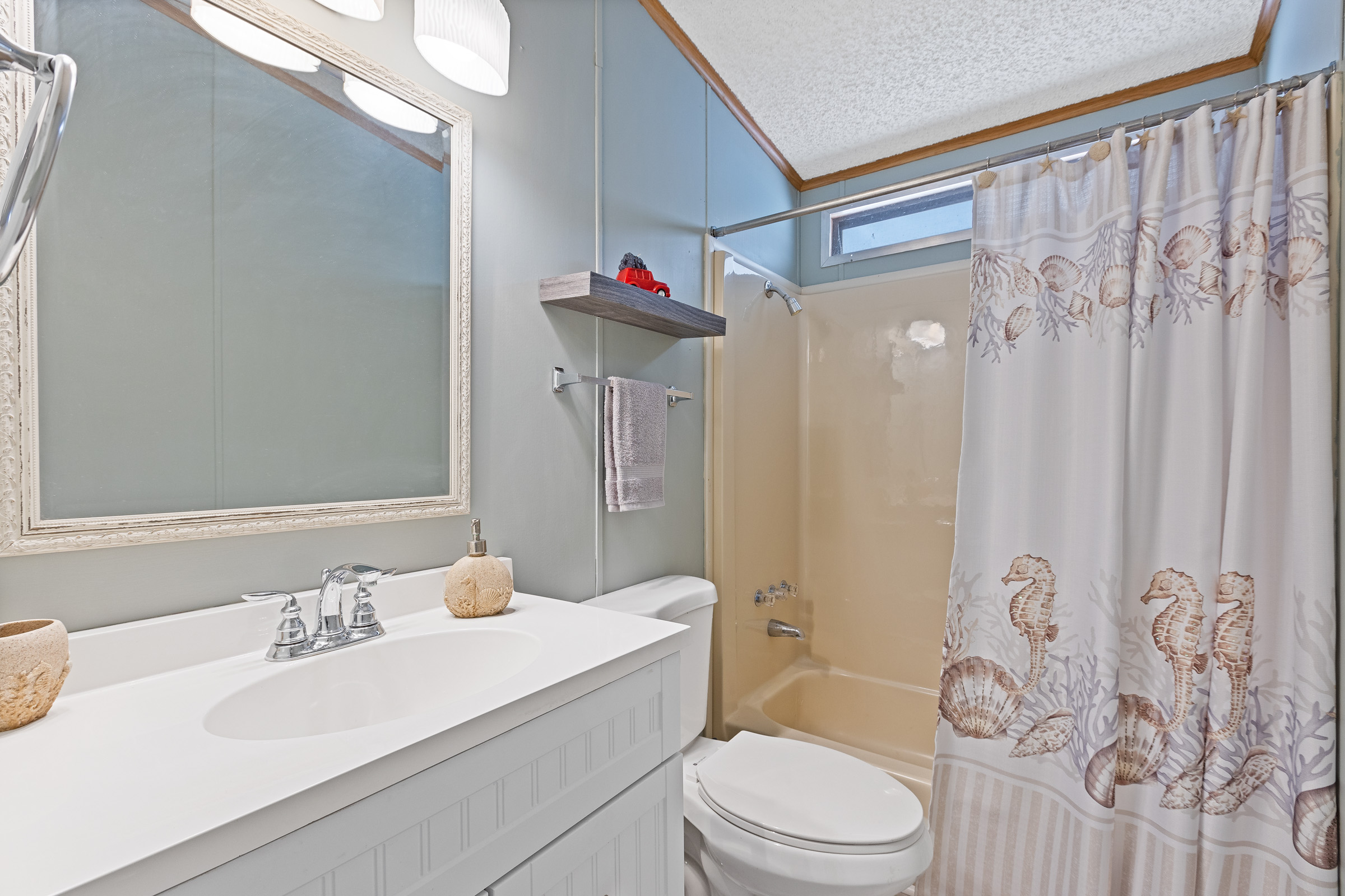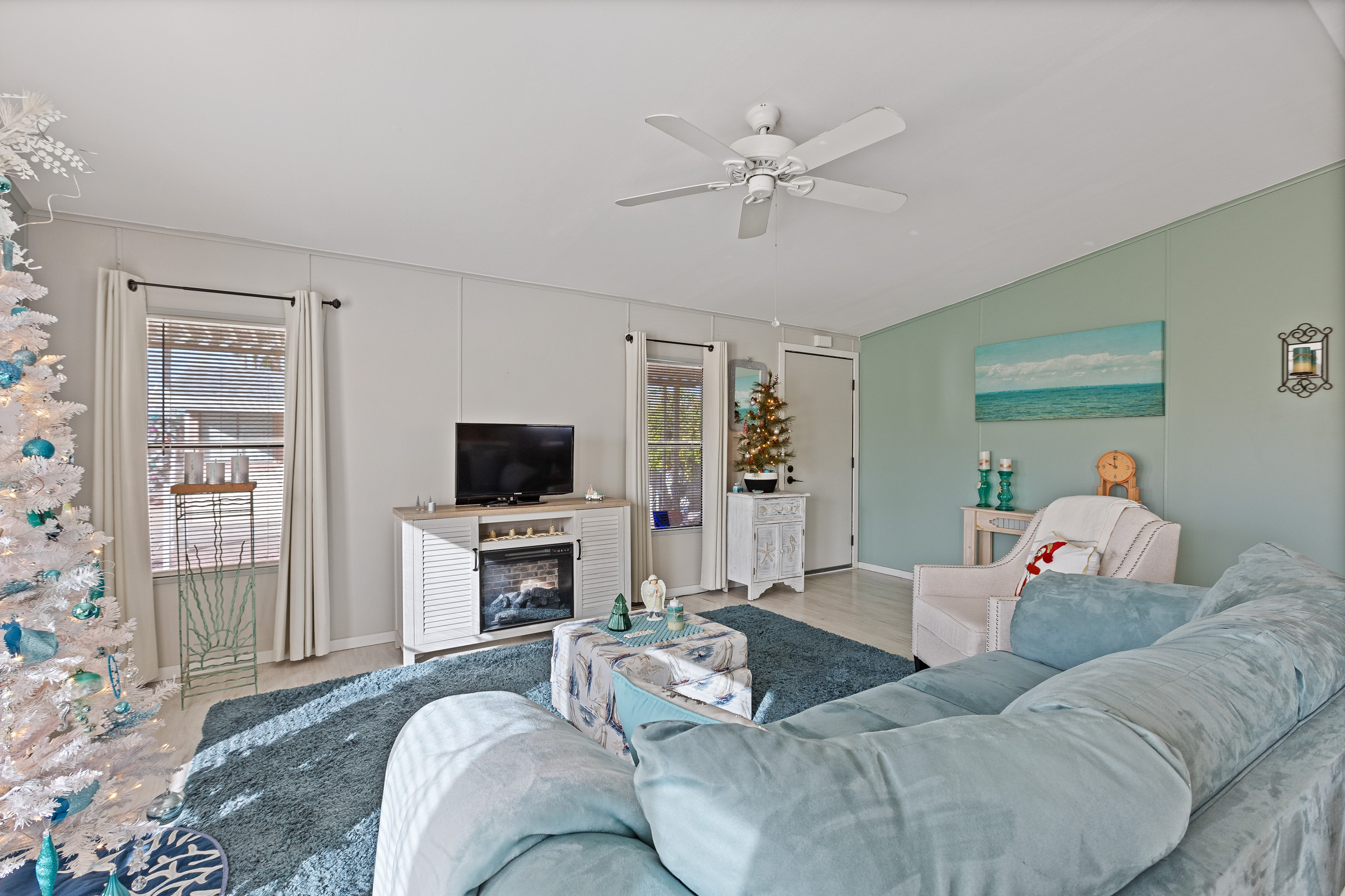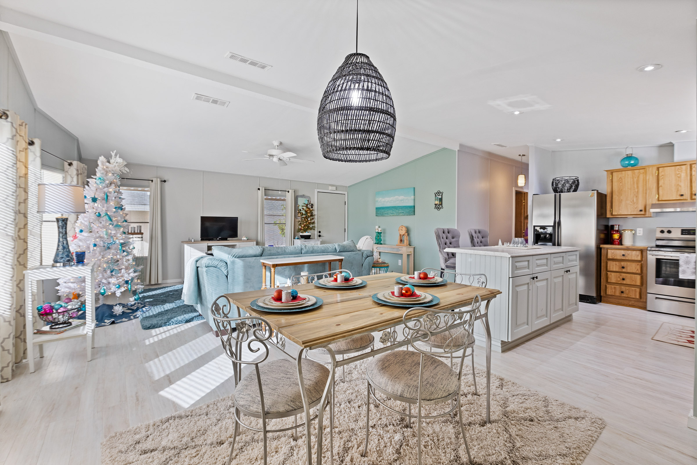 Charming 2-bedroom, 2-bath home offering 1,248 sq. ft. of stylish, comfortable living in a bright coastal-inspired setting. The open-concept floor plan is perfect for both everyday living and entertaining, featuring a spacious kitchen with a center island and breakfast bar that flows seamlessly into the living and dining areas. Coastal color palettes and durable laminate flooring create a light, airy feel throughout the home. The private primary suite includes a double-seated step-in shower, while the guest bathroom features a tub/shower combo and a brand-new vanity, providing comfort and convenience for visitors. Enjoy peace of mind with major updates already completed, including a new roof (2024), new awnings (2024), A/C (2019), and furnace (2019). Outdoor living is enhanced by a patio with epoxy coating, perfect for relaxing or entertaining, along with a storage shed for added functionality. Call to schedule your personal tour today! (480) 325-1161