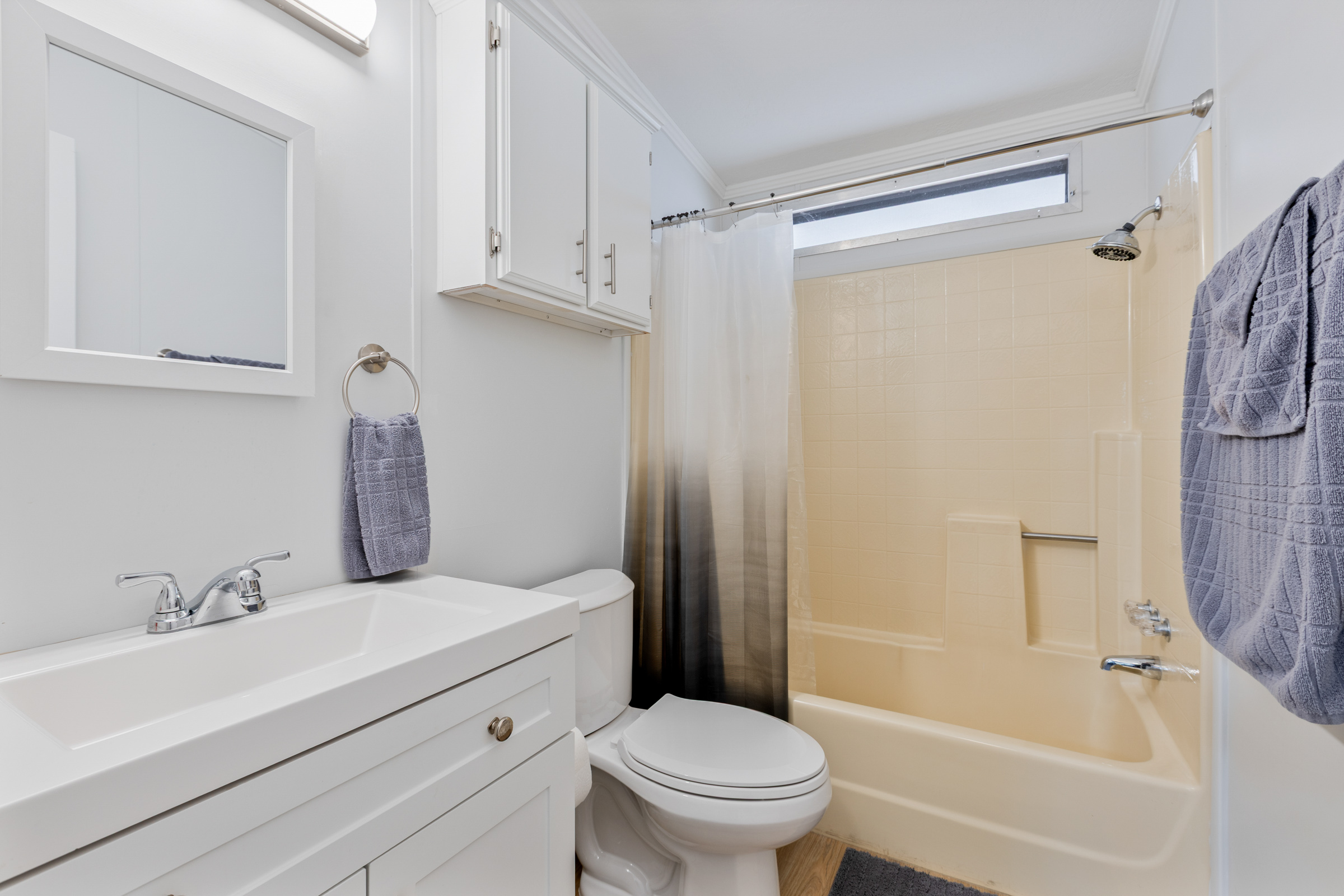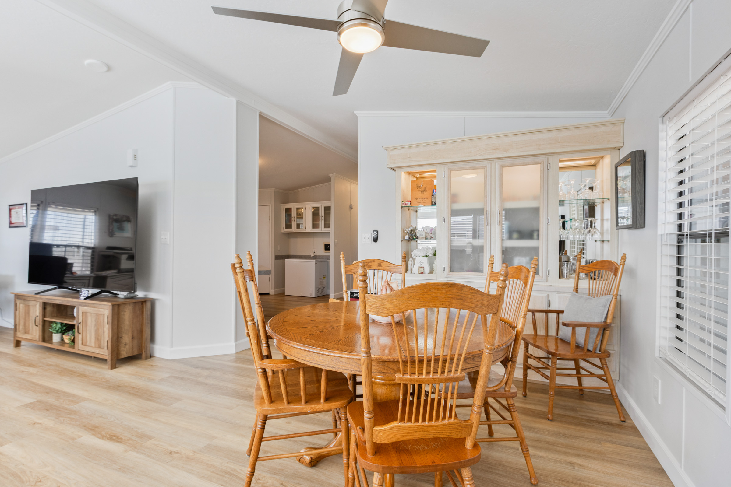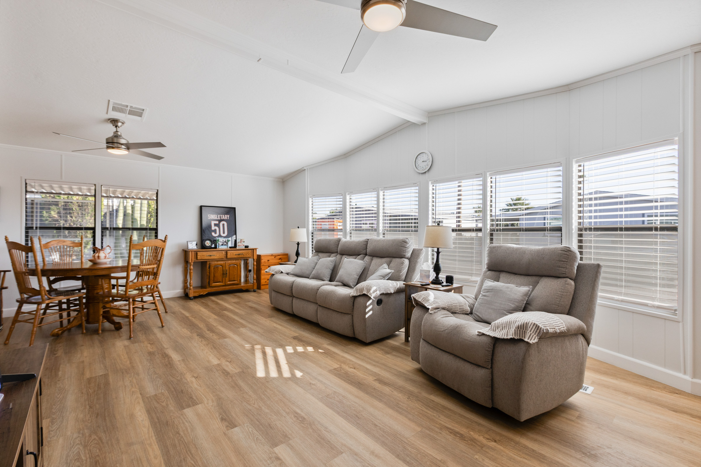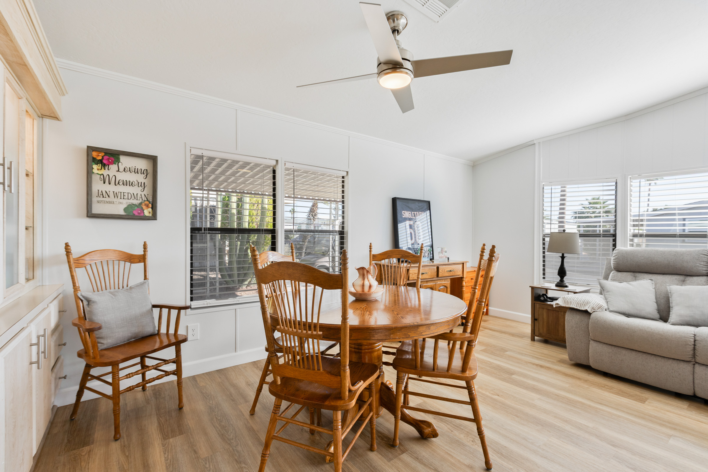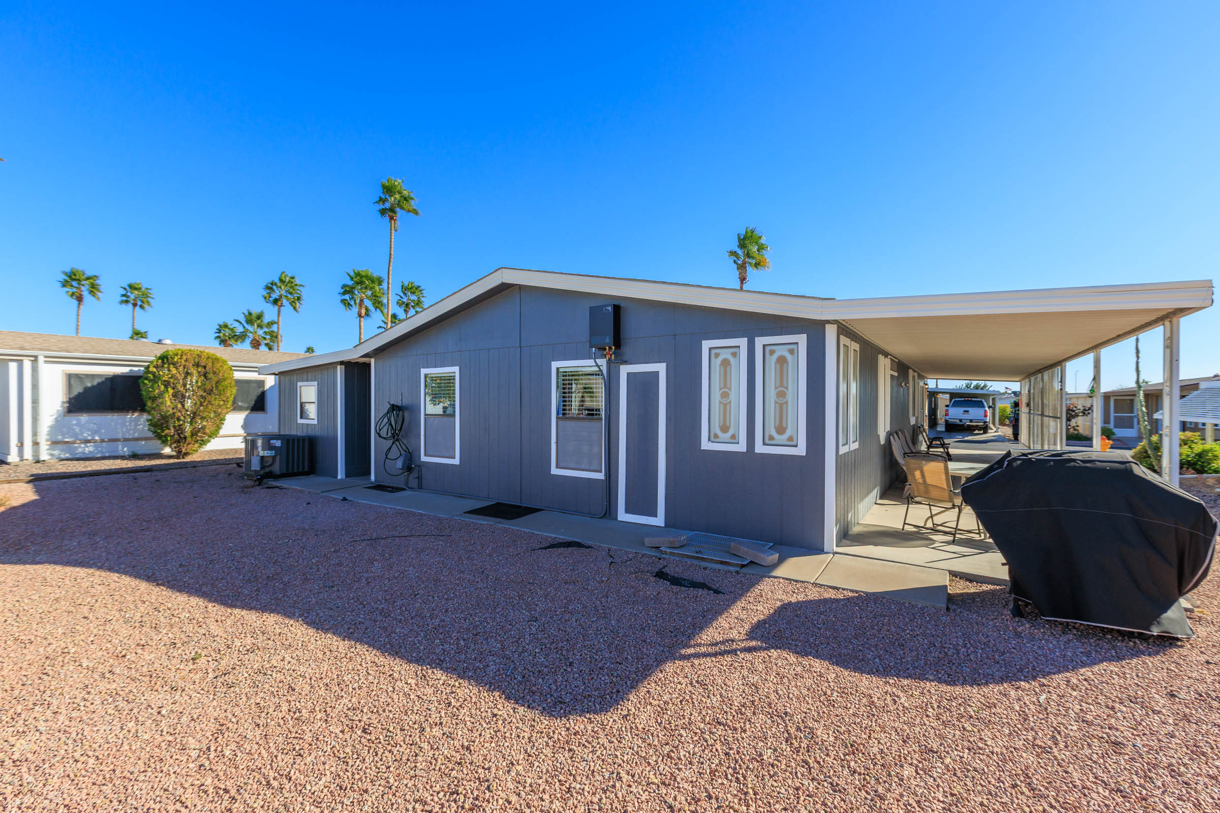 Beautifully updated 2-bedroom, 2-bath home with 1,352 sq ft. Fresh interior and exterior paint pairs perfectly with new vinyl plank flooring and new ceiling fans throughout. The kitchen shines with refinished countertops, new stainless steel appliances, a center island with breakfast bar, ample pantry storage, and new skylights that fill the space with natural light. Both bathrooms have been newly updated—the spacious primary suite features dual sinks and a step-in shower, while the guest bath includes a tub/shower combo. Additional upgrades include a new tankless water heater, new reverse osmosis system, roof replaced in 2023, and A/C (2019). A laundry room with washer and dryer adds convenience, and the storage shed provides extra space for tools or hobbies. Call to schedule your personal tour today! (480) 325-1161