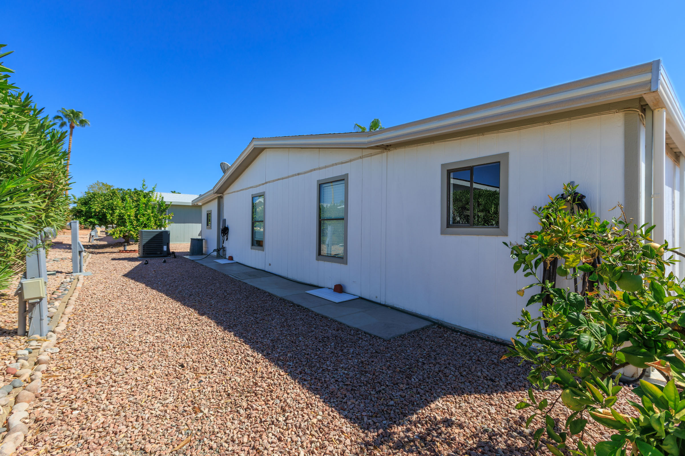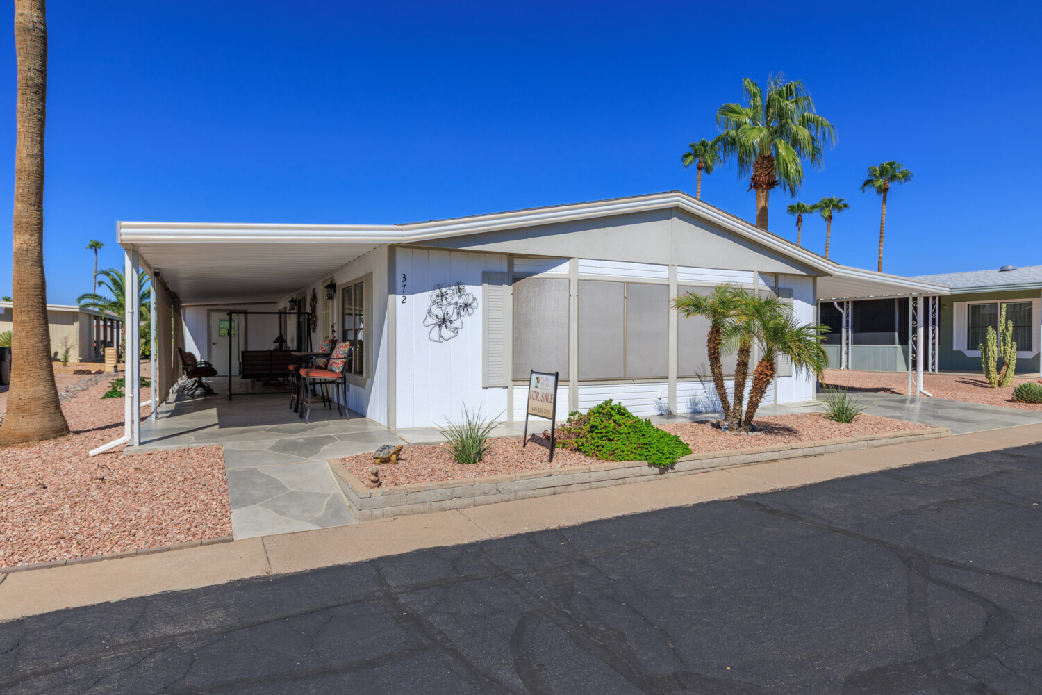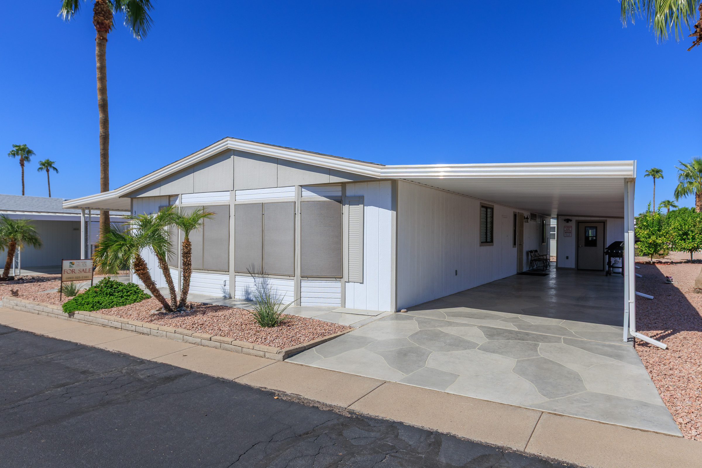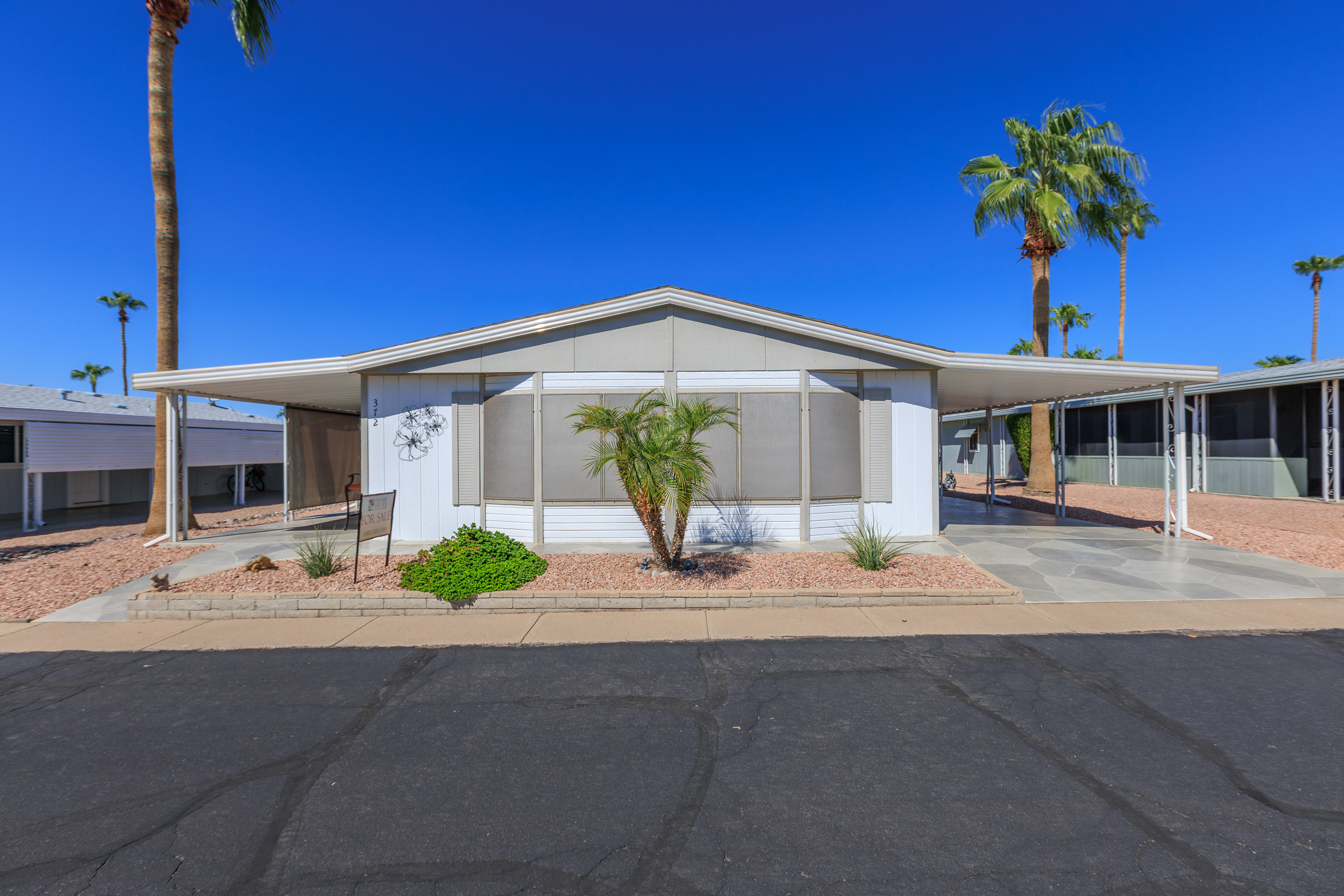 This beautifully updated 2-bedroom, 2-bath, 1,652 sq. ft. home comes fully furnished and equipped—ideal for snowbirds looking for a turnkey retreat. Recent upgrades include a roof (approx. 5 years), new A/C and furnace (2024), new plumbing, soft-close cabinetry, granite countertops, new fridge and dishwasher, and laminate flooring throughout. The spacious kitchen offers a breakfast bar, pantry with pull-out shelves, and ample storage, while the laundry room doubles as a workspace with a desk, utility sink, washer, and dryer. The master suite features dual sinks and a resort-style walk-in shower, and the guest bath includes a tub/shower combo with a new vanity. Outside, enjoy two storage sheds, a mini fridge and mini freezer that convey, plus citrus trees (orange and lemon) with irrigation. The driveway and patio are finished with a stylish flagstone-look epoxy coating, making this home move-in ready and perfect for enjoying Arizona living. Call to schedule your personal tour today! (480) 325-1161