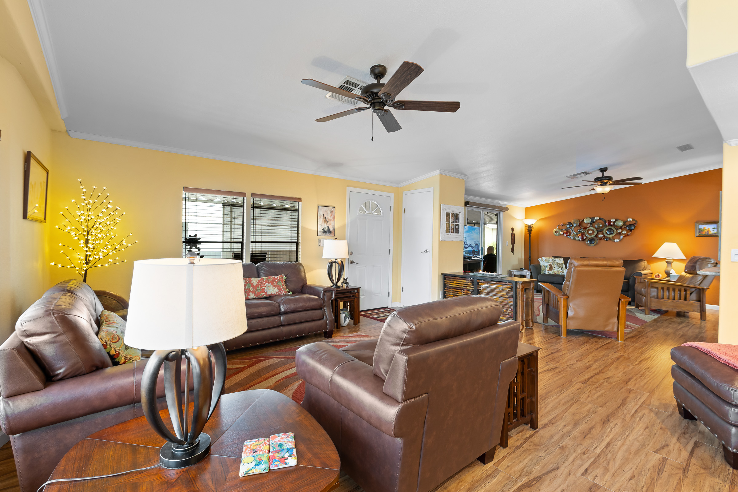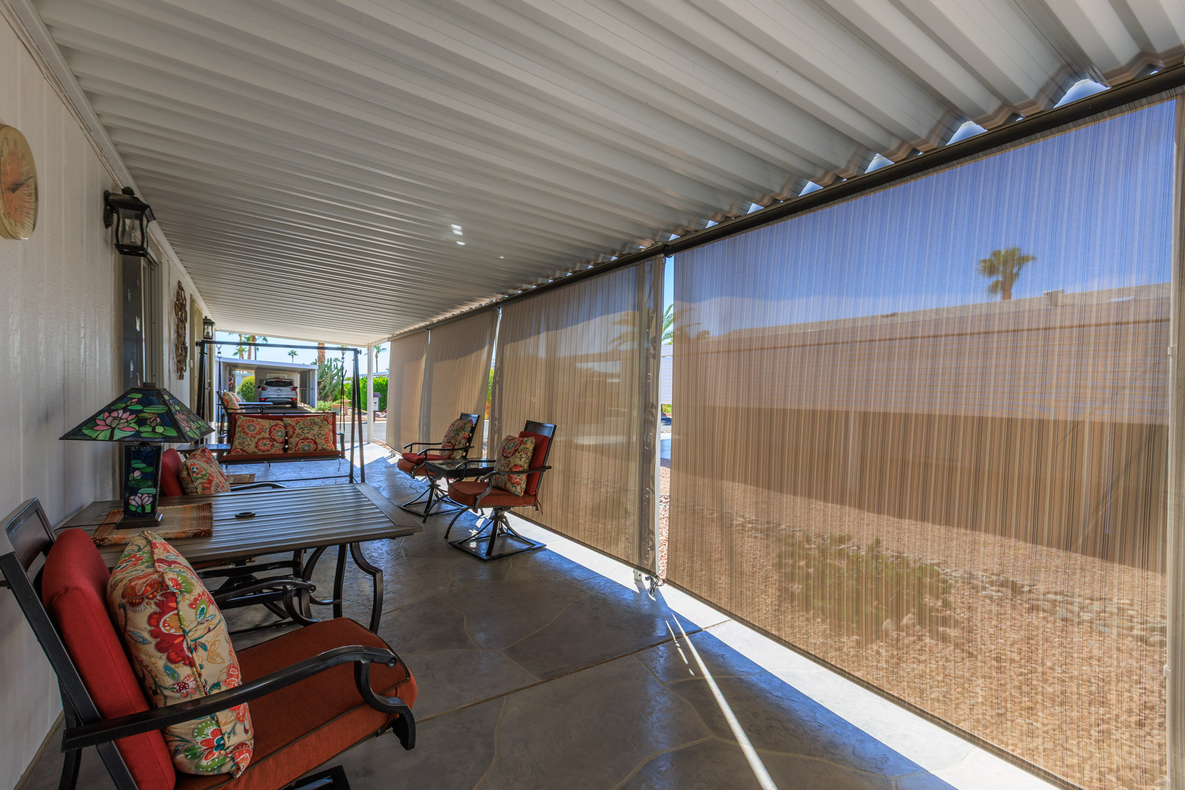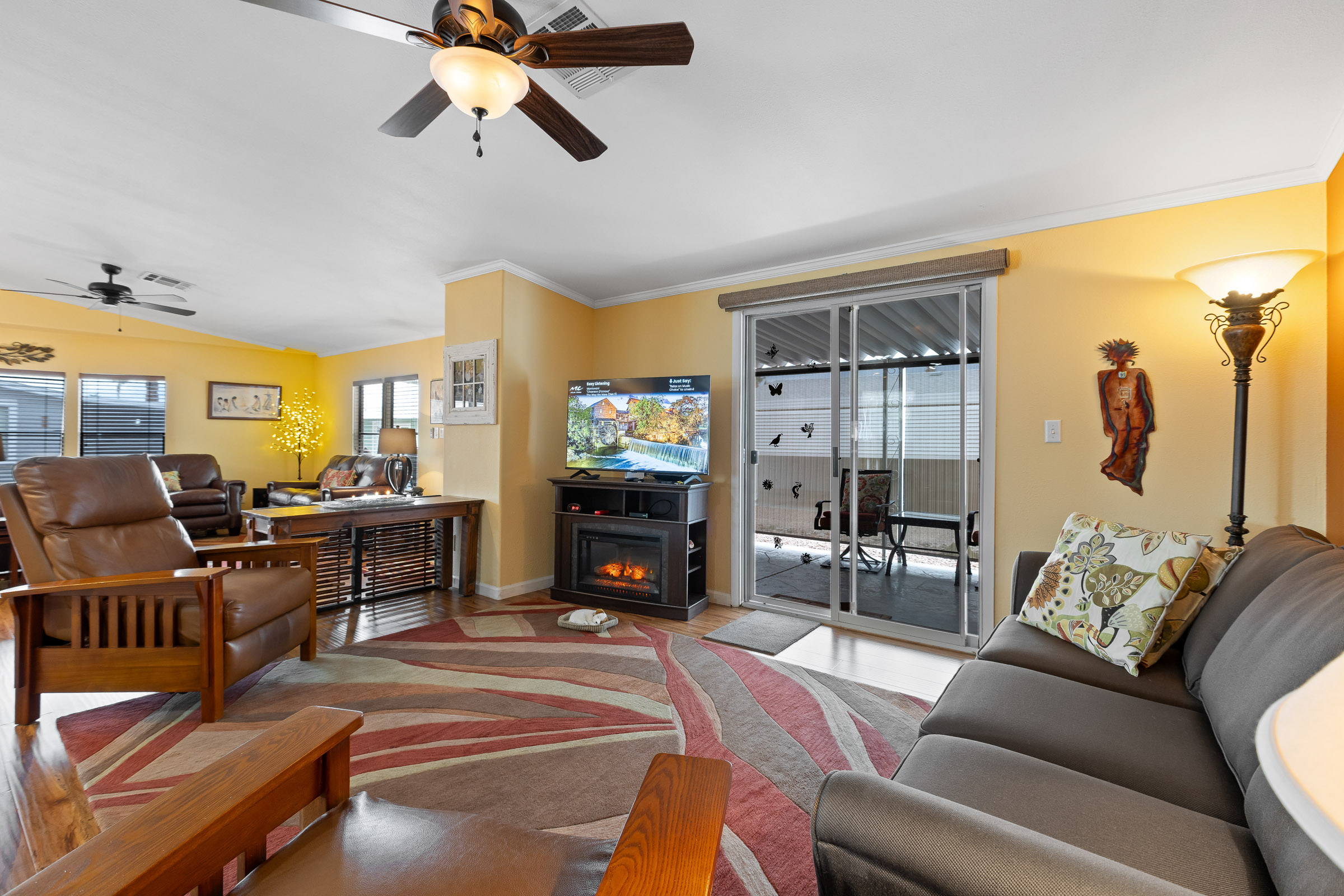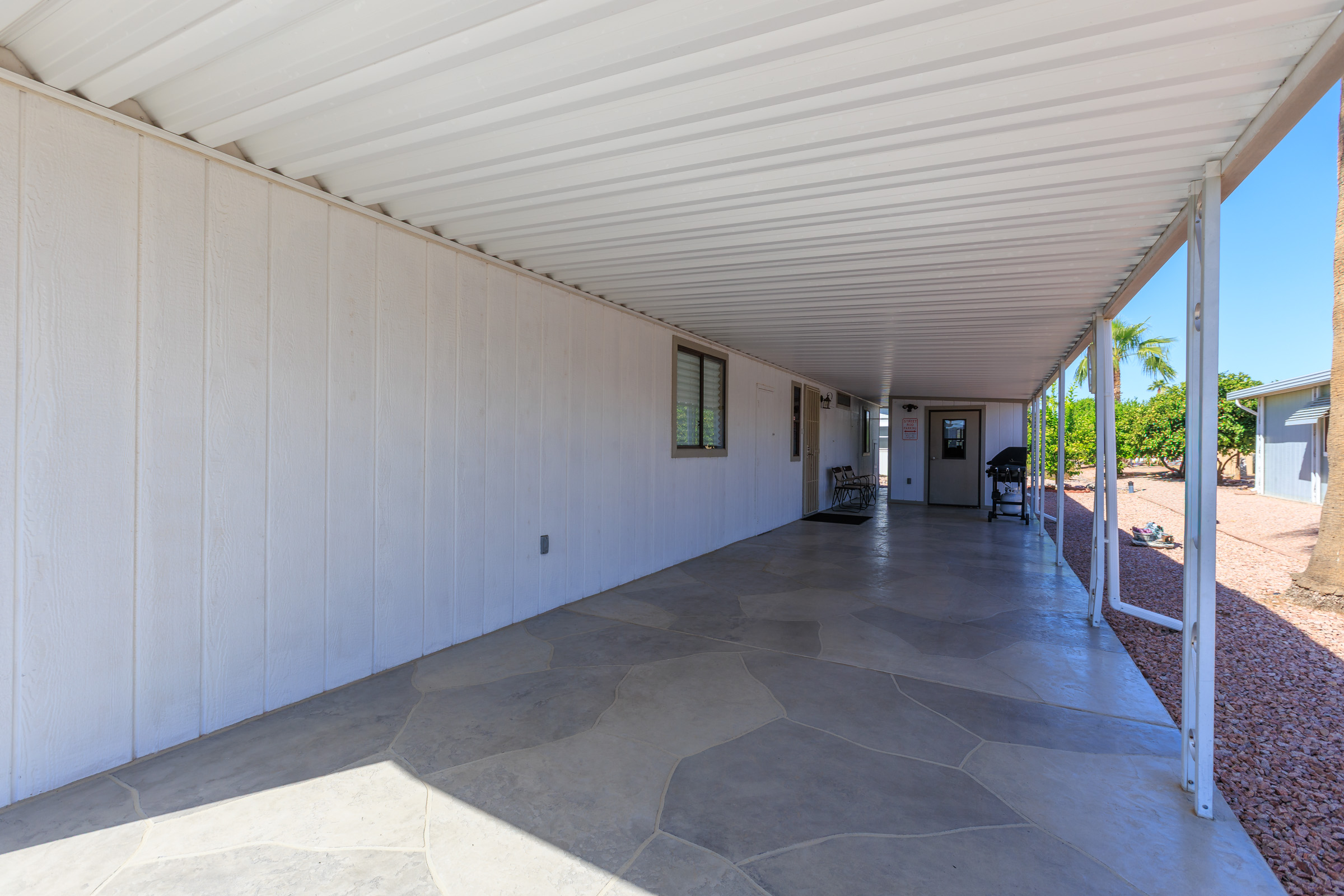 This beautifully updated 2-bedroom, 2-bath, 1,652 sq. ft. home comes fully furnished and equipped—ideal for snowbirds looking for a turnkey retreat. Recent upgrades include a roof (approx. 5 years), new A/C and furnace (2024), new plumbing, soft-close cabinetry, granite countertops, new fridge and dishwasher, and laminate flooring throughout. The spacious kitchen offers a breakfast bar, pantry with pull-out shelves, and ample storage, while the laundry room doubles as a workspace with a desk, utility sink, washer, and dryer. The master suite features dual sinks and a resort-style walk-in shower, and the guest bath includes a tub/shower combo with a new vanity. Outside, enjoy two storage sheds, a mini fridge and mini freezer that convey, plus citrus trees (orange and lemon) with irrigation. The driveway and patio are finished with a stylish flagstone-look epoxy coating, making this home move-in ready and perfect for enjoying Arizona living. Call to schedule your personal tour today! (480) 325-1161