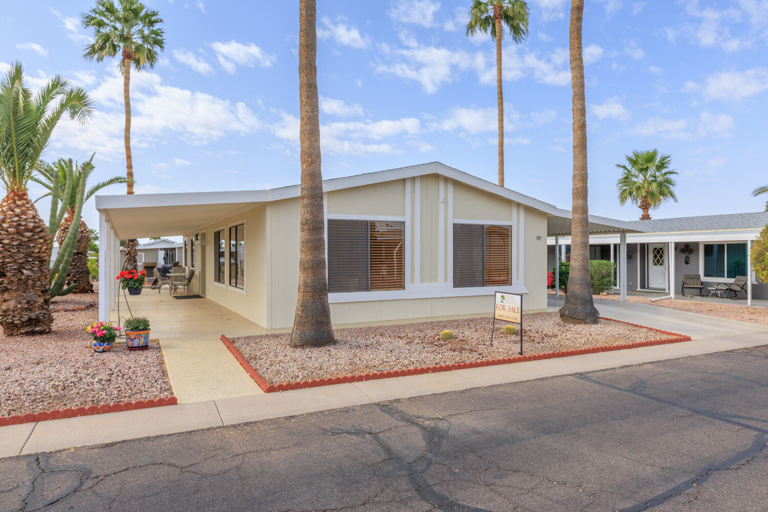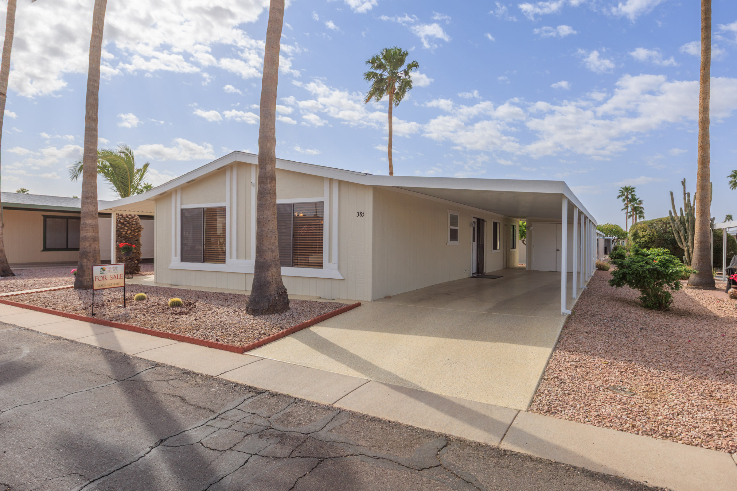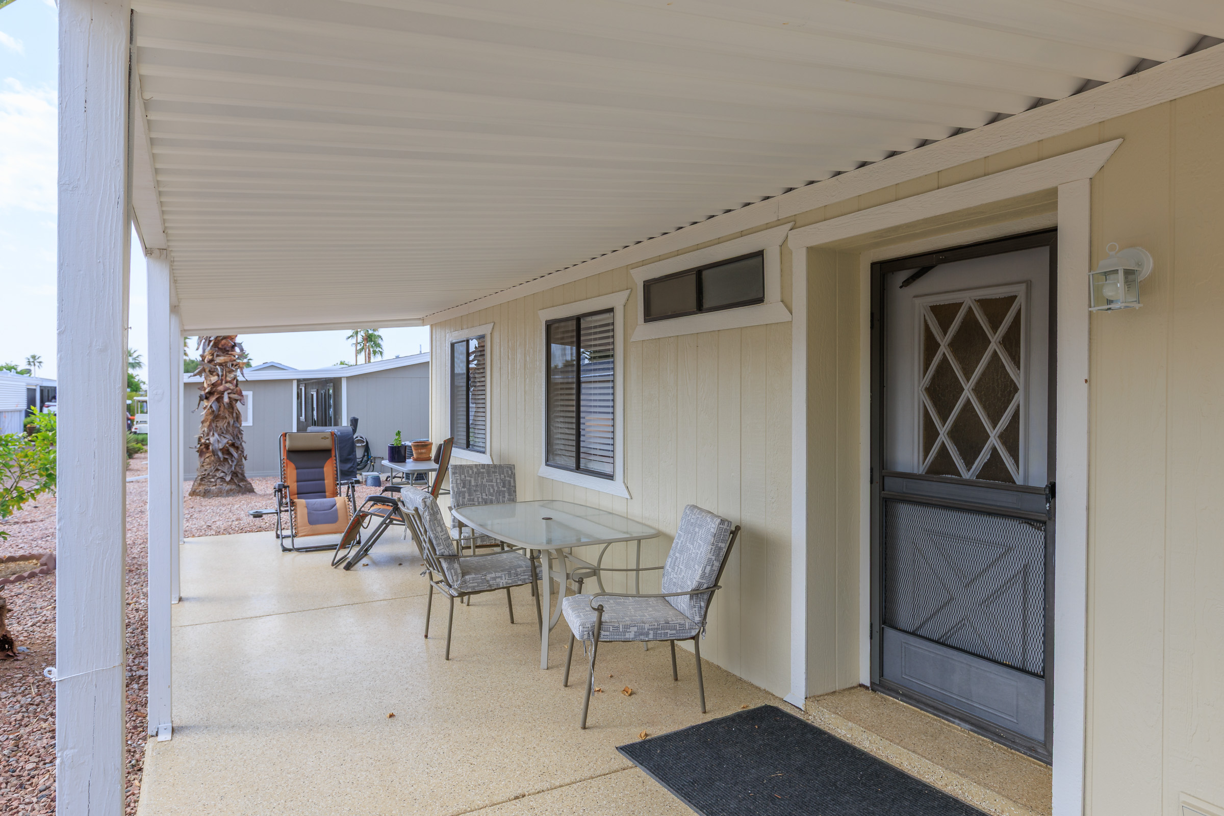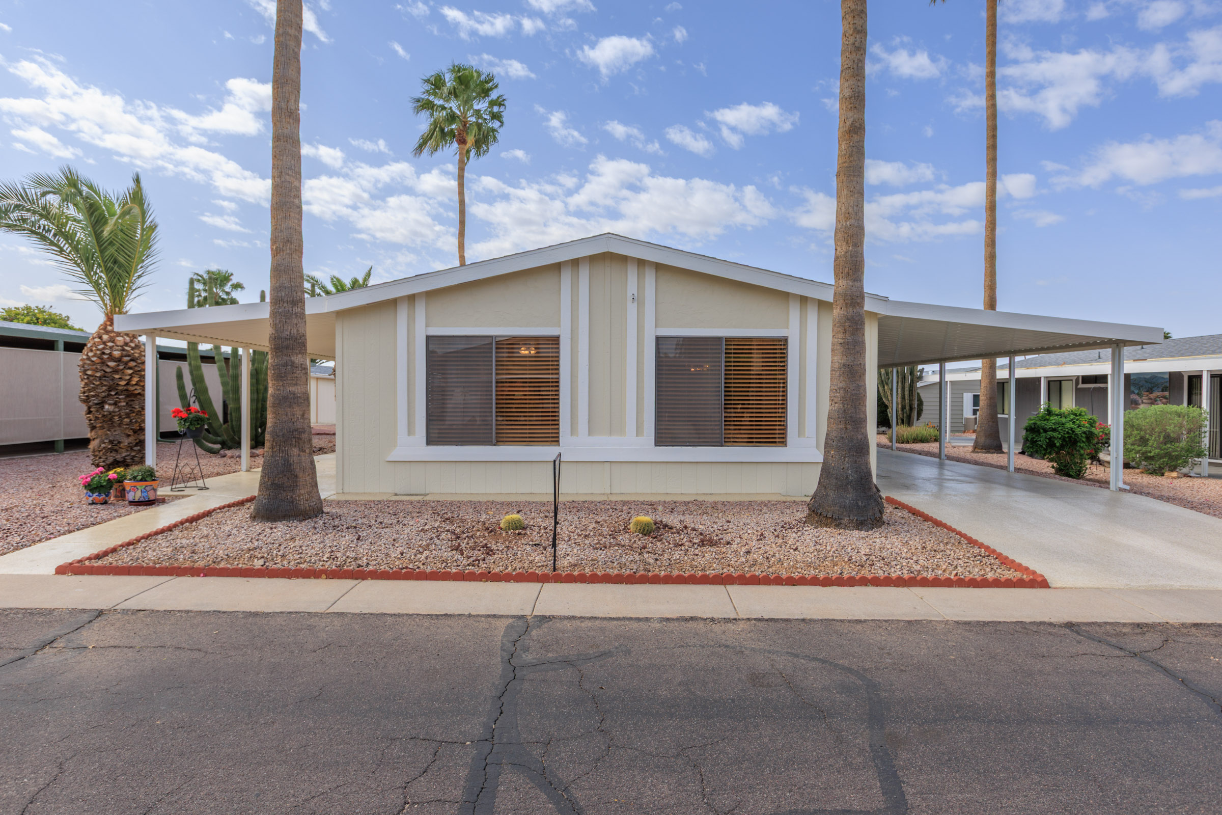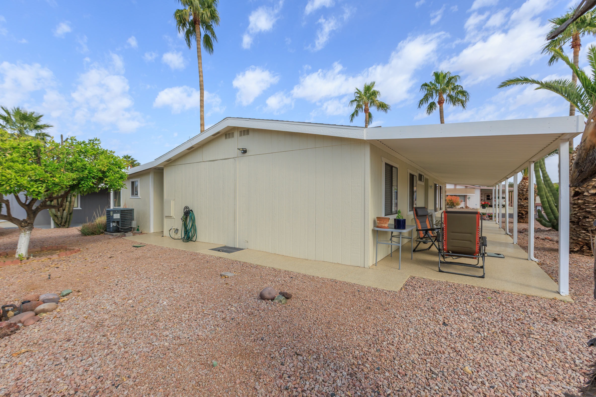 Photos shown are from the former owner — new photos coming soon! Remodeled 2-bedroom, 2-bath with 1,248 sq. ft. and modern updates throughout. Features include tape and textured ceilings, laminate flooring, and a stylish kitchen with new white soft-close cabinets, stainless steel appliances, a deep sink, and pantry. Laundry room includes washer, dryer, and built-in desk. The primary bath offers a soaking tub, step-in shower, and dual sinks; the guest bath has a double-seated shower. Recent upgrades include a new roof and carport awning (2023) and epoxy-coated patio and carport (2025). Outside, enjoy lush landscaping with irrigation, palm trees, and orange and lemon trees, plus a handy storage shed. Call to schedule your personal tour today! (480) 325-1161