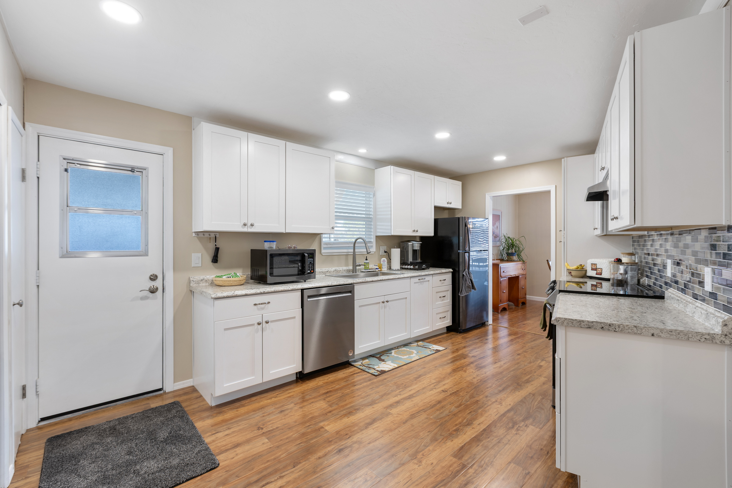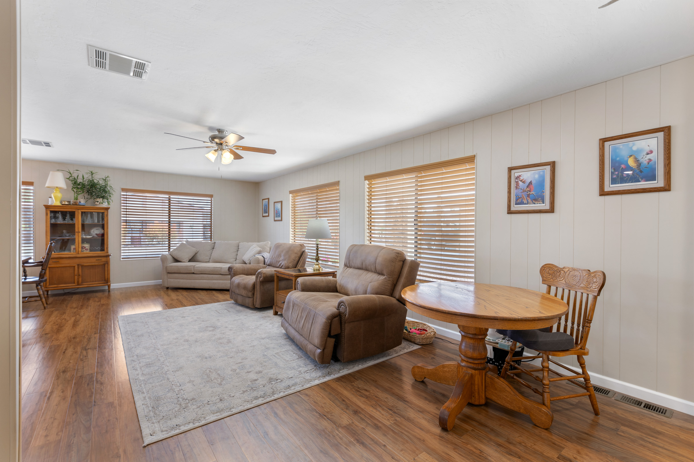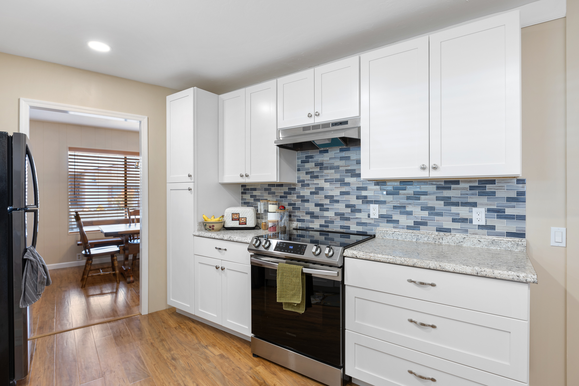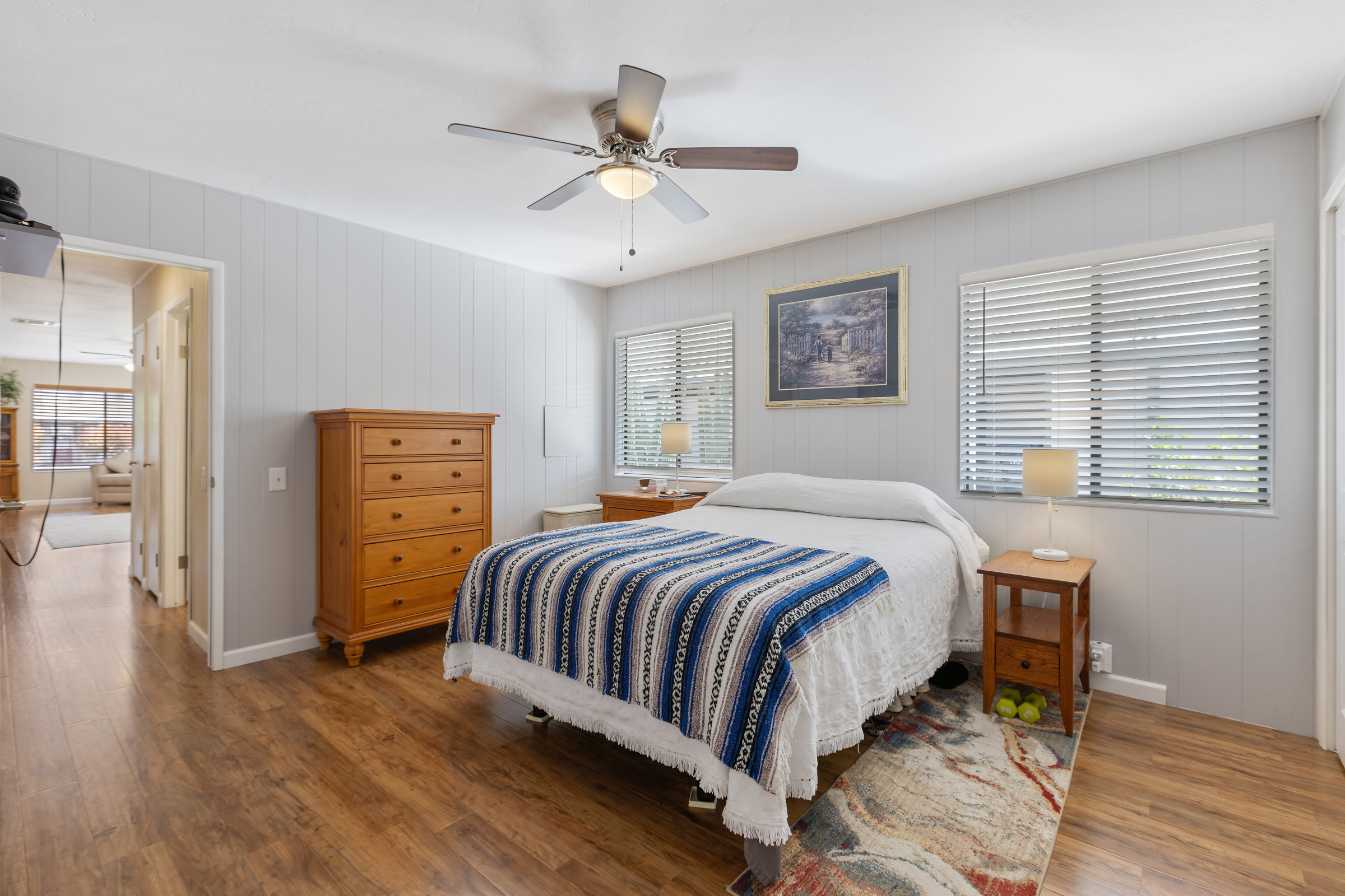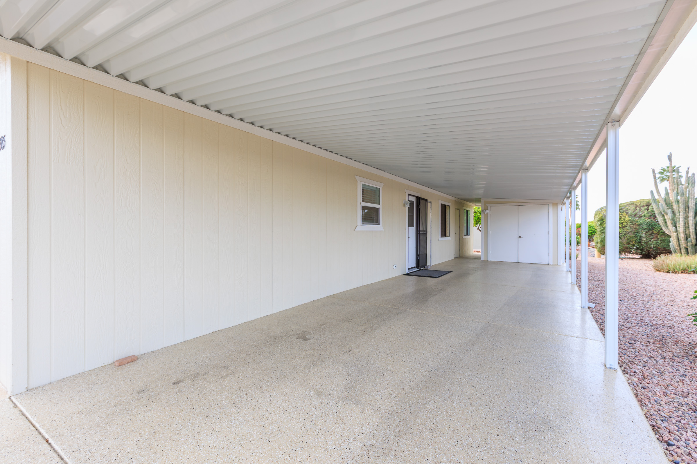 Photos shown are from the former owner — new photos coming soon! Remodeled 2-bedroom, 2-bath with 1,248 sq. ft. and modern updates throughout. Features include tape and textured ceilings, laminate flooring, and a stylish kitchen with new white soft-close cabinets, stainless steel appliances, a deep sink, and pantry. Laundry room includes washer, dryer, and built-in desk. The primary bath offers a soaking tub, step-in shower, and dual sinks; the guest bath has a double-seated shower. Recent upgrades include a new roof and carport awning (2023) and epoxy-coated patio and carport (2025). Outside, enjoy lush landscaping with irrigation, palm trees, and orange and lemon trees, plus a handy storage shed. Call to schedule your personal tour today! (480) 325-1161