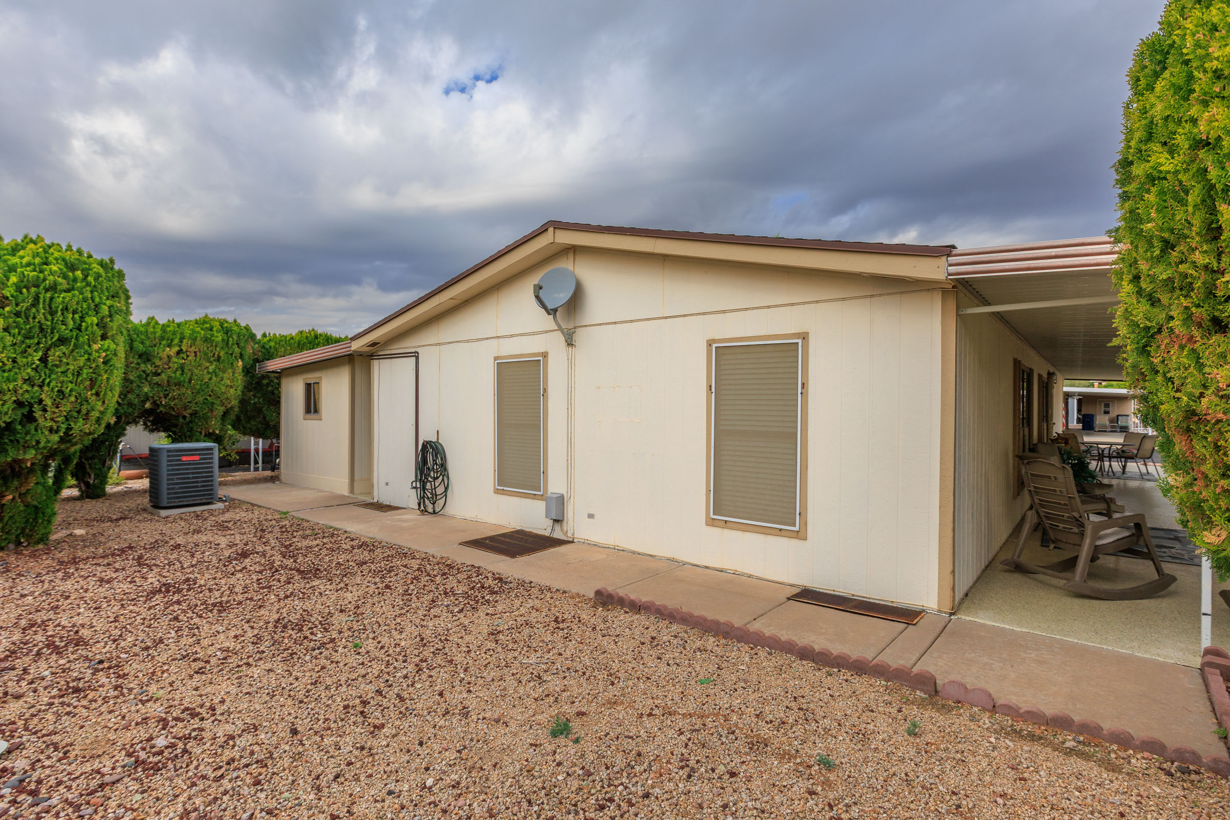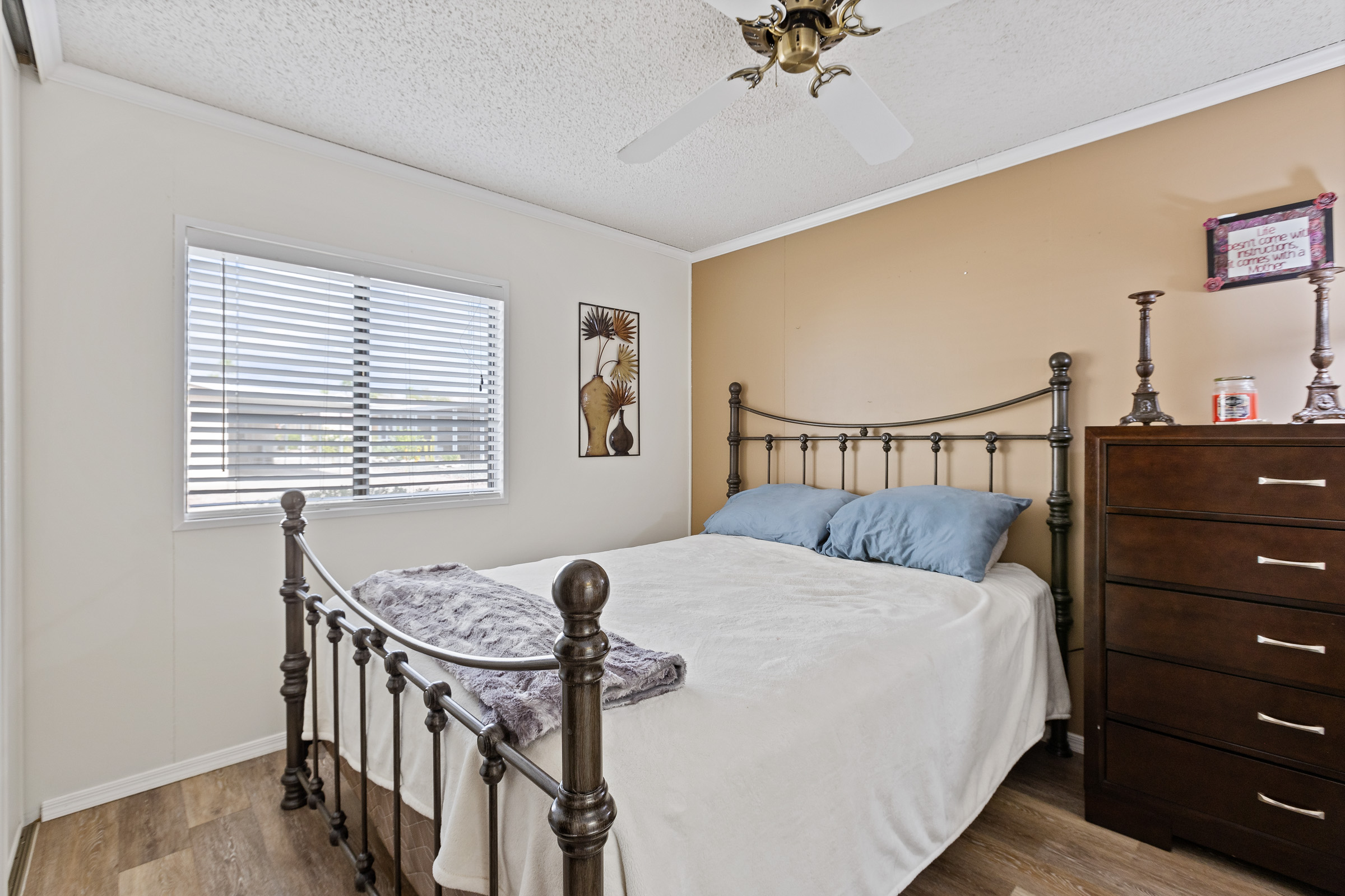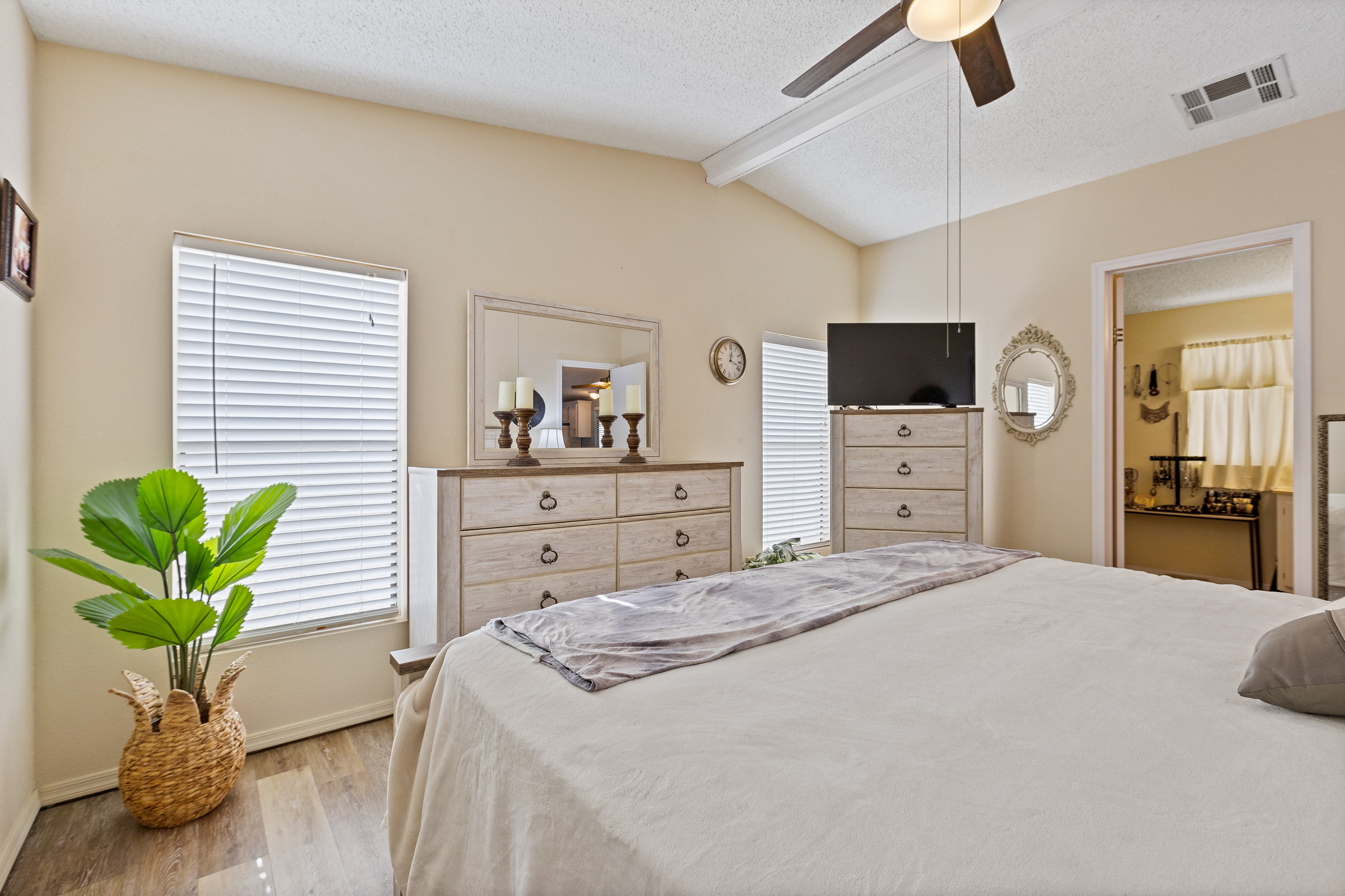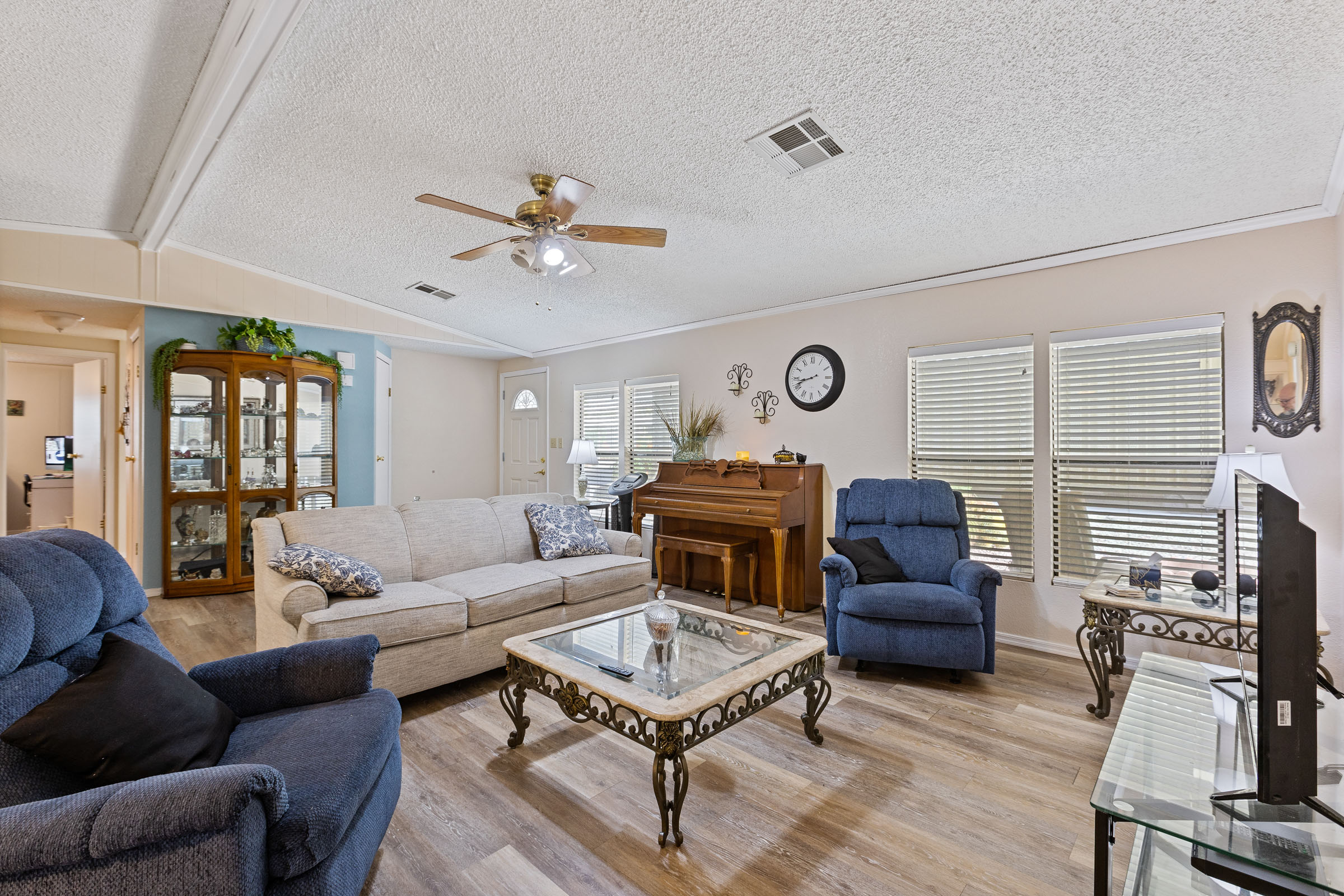 Welcome home to this beautifully updated 3-bedroom, 2-bath split floorplan offering 1,456 sq. ft. of comfortable living space. The main living areas feature tape and textured walls, complemented by new vinyl plank flooring throughout for a modern, cohesive look. The bright kitchen showcases crisp white cabinetry and a convenient breakfast bar, perfect for casual dining and entertaining. The spacious primary suite includes a private bath with dual sinks and a step-in shower, while the guest bathroom offers a tub/shower combination for added versatility. Outdoor features include a storage shed, new epoxy-coated driveway and patio, and a dedicated golf cart pad, adding both functionality and curb appeal. This well-maintained home blends style, comfort, and practical upgrades—move-in ready and waiting for you! Call to schedule your personal tour today! (480) 325-1161