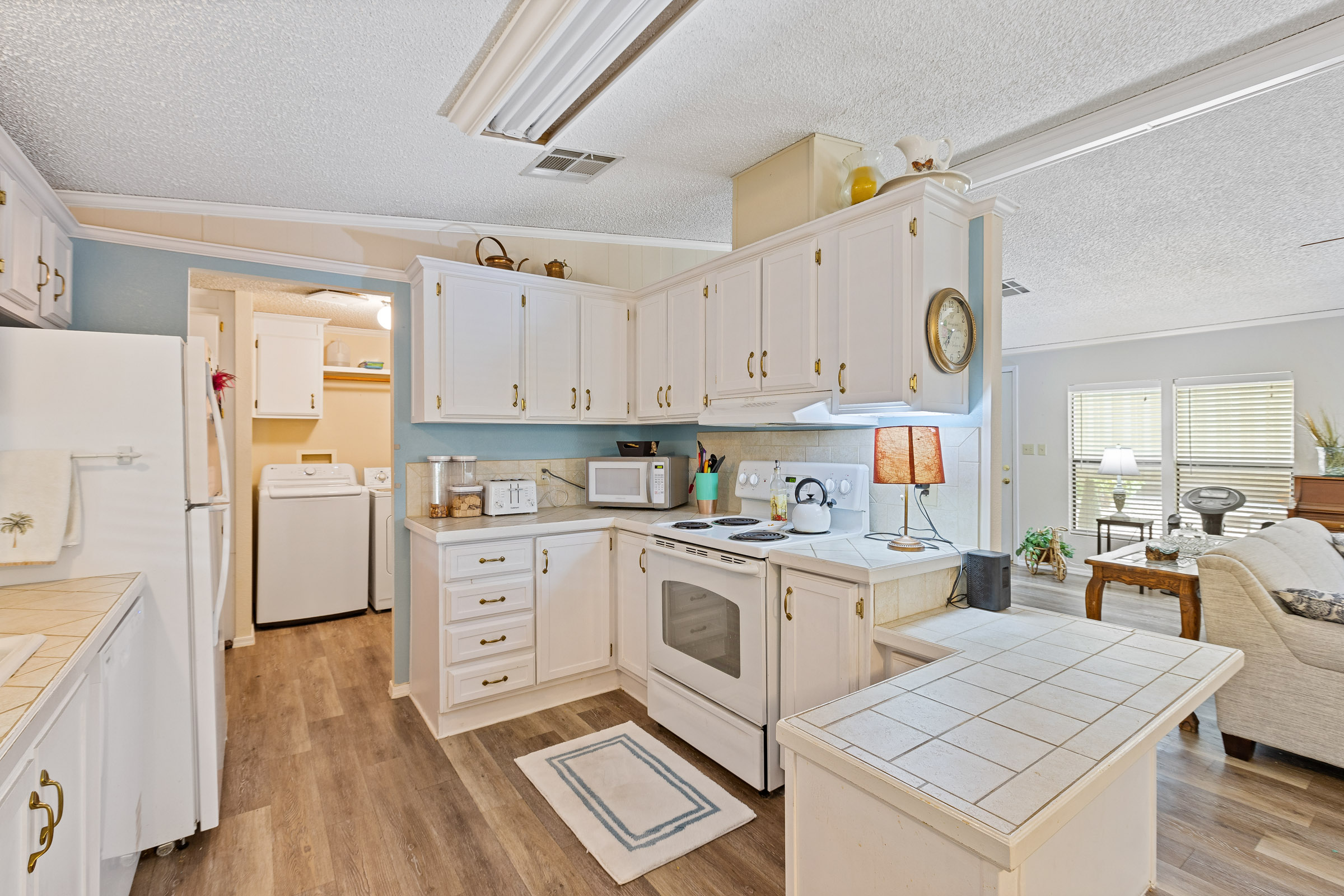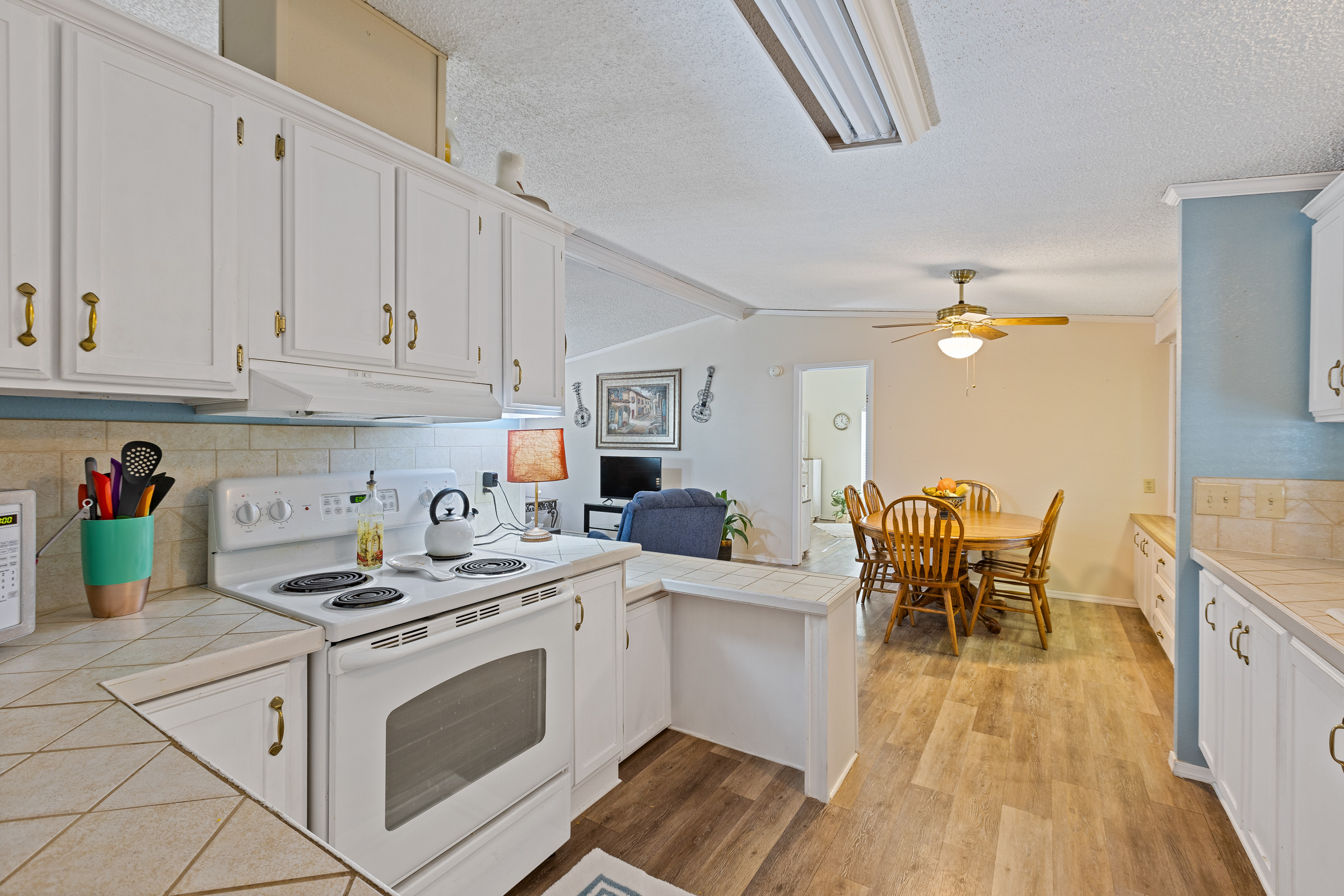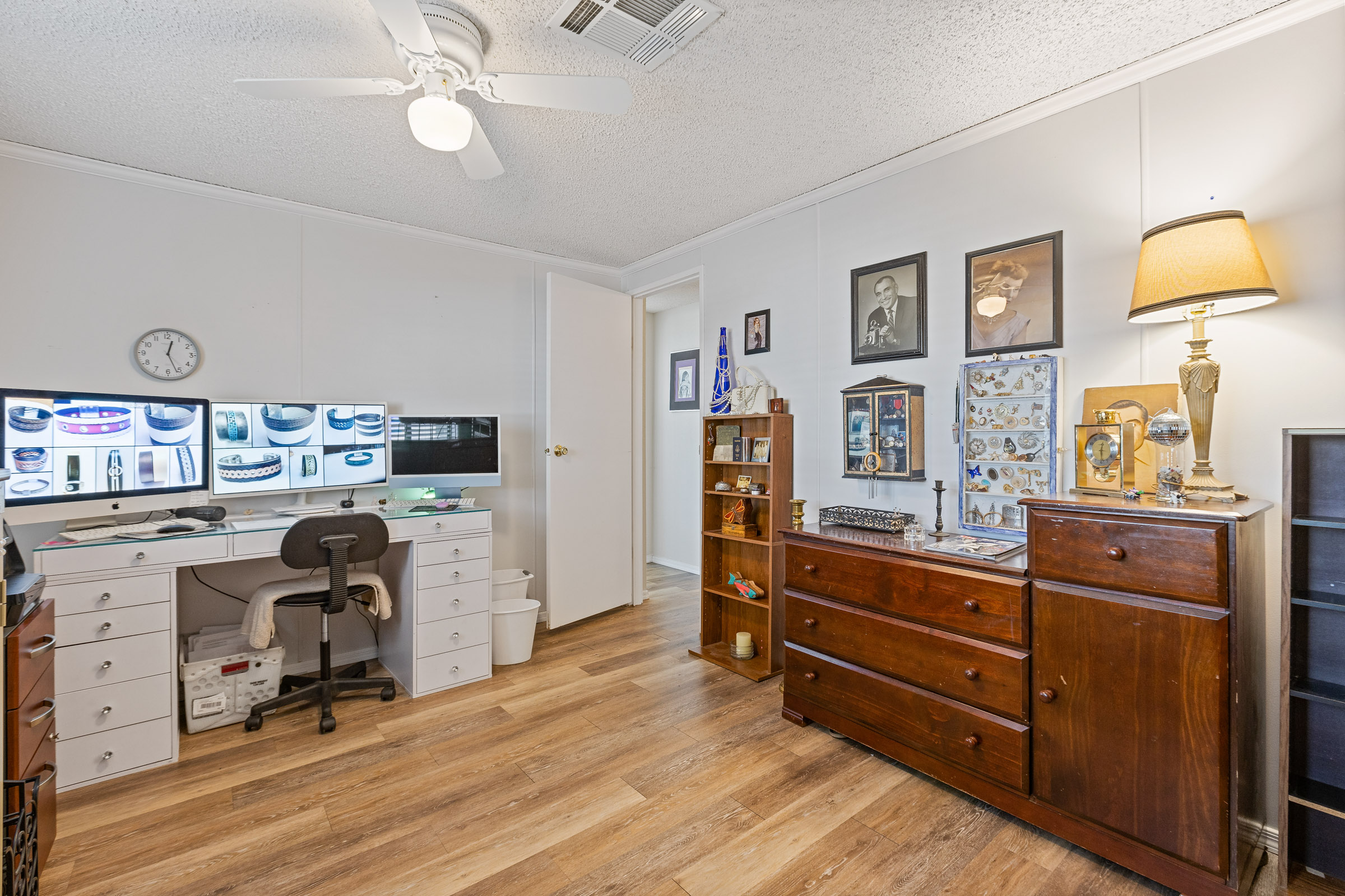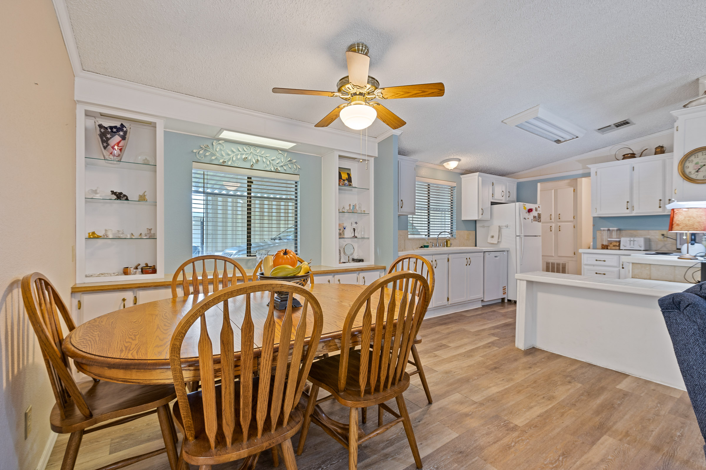 Welcome home to this beautifully updated 3-bedroom, 2-bath split floorplan offering 1,456 sq. ft. of comfortable living space. The main living areas feature tape and textured walls, complemented by new vinyl plank flooring throughout for a modern, cohesive look. The bright kitchen showcases crisp white cabinetry and a convenient breakfast bar, perfect for casual dining and entertaining. The spacious primary suite includes a private bath with dual sinks and a step-in shower, while the guest bathroom offers a tub/shower combination for added versatility. Outdoor features include a storage shed, new epoxy-coated driveway and patio, and a dedicated golf cart pad, adding both functionality and curb appeal. This well-maintained home blends style, comfort, and practical upgrades—move-in ready and waiting for you! Call to schedule your personal tour today! (480) 325-1161