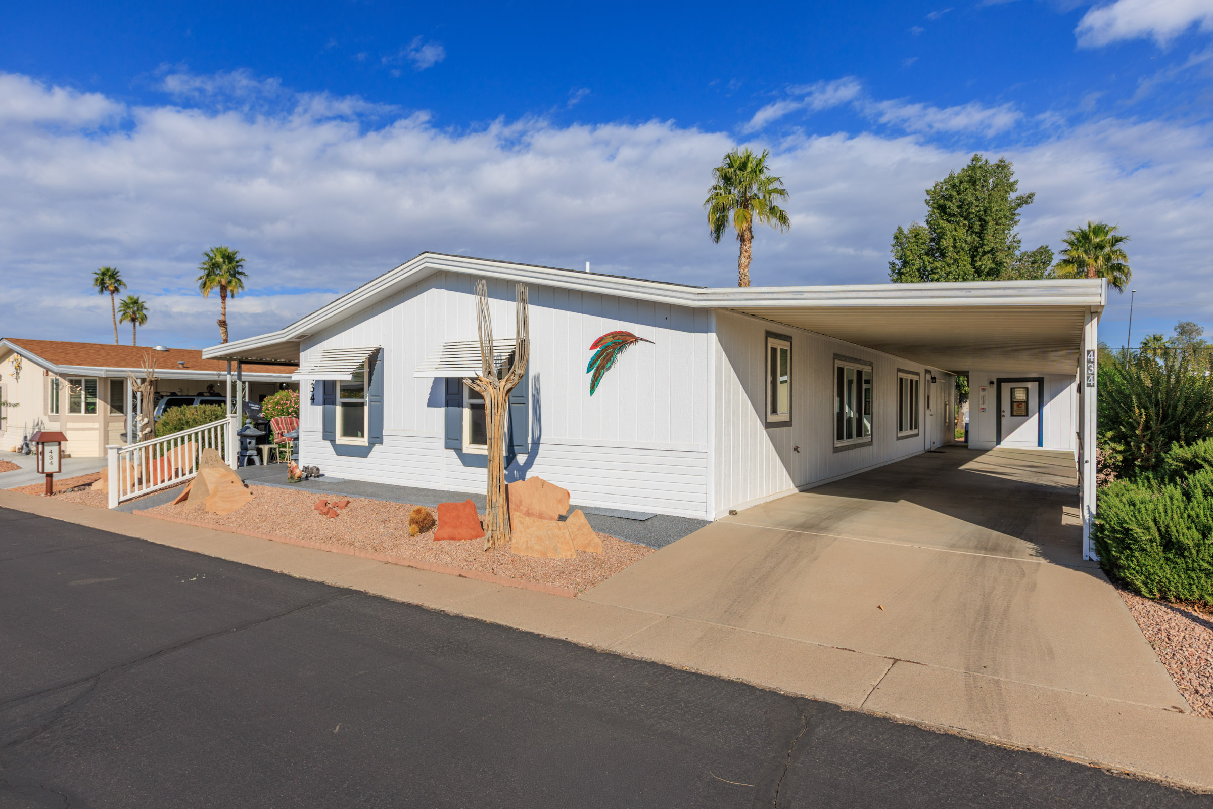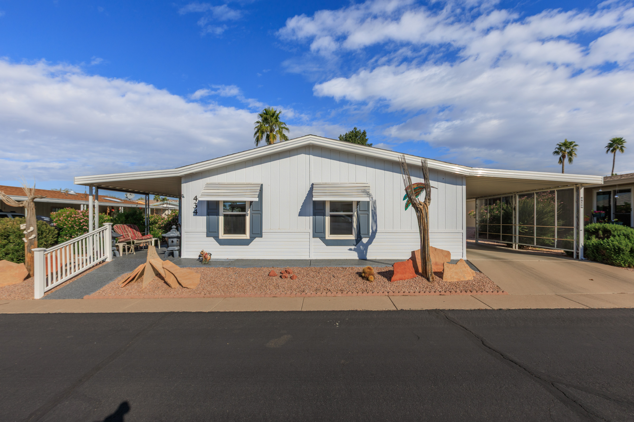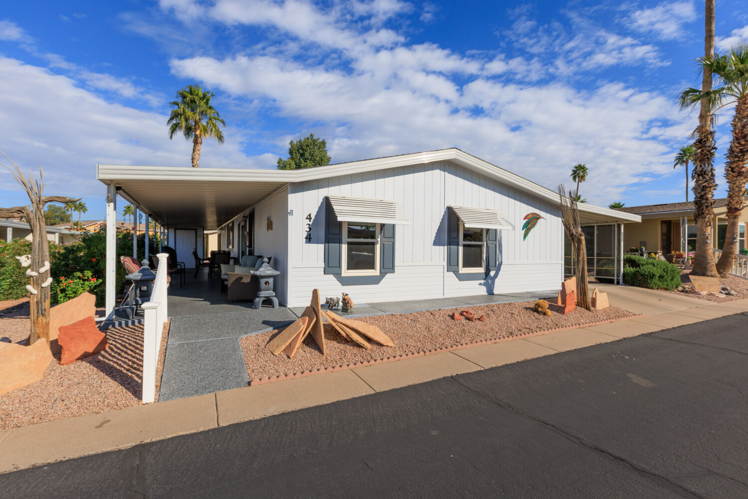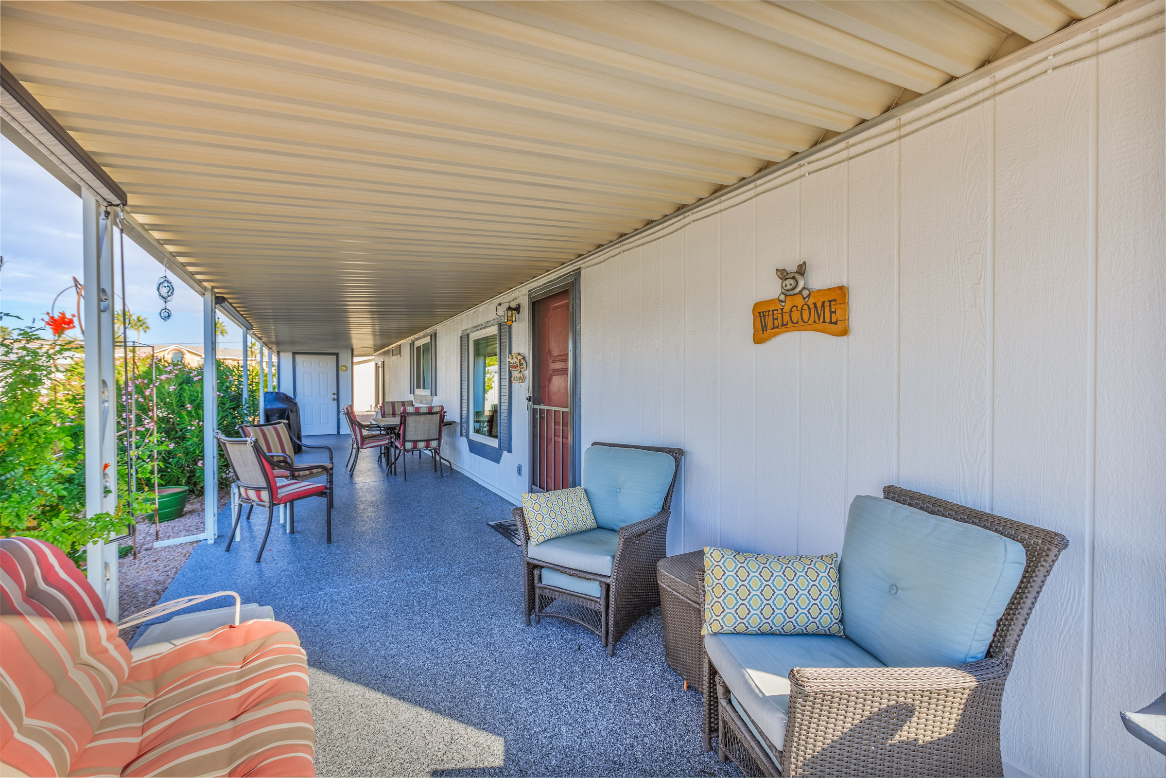 Beautifully maintained 3 bedroom, 2 bath home offers 1,664 sq ft of thoughtfully designed living space—fully furnished and truly move-in ready. Major updates include a new roof (2023), A/C (2022), and fresh exterior paint (2023). Inside, you’ll find laminate flooring throughout and dual pane windows that enhance both comfort and energy efficiency. The kitchen features a built-in island with granite countertop and breakfast bar, plus an additional bar off the dining room. The primary suite is a true retreat with dual sinks and a large tiled step-in shower accented by upgraded glass doors. The guest bath has also been updated with a stylish step-in shower. Outdoor you’ll find an epoxy-coated patio, two storage sheds, and a lemon tree. Call to schedule your personal tour today! (480) 325-1161