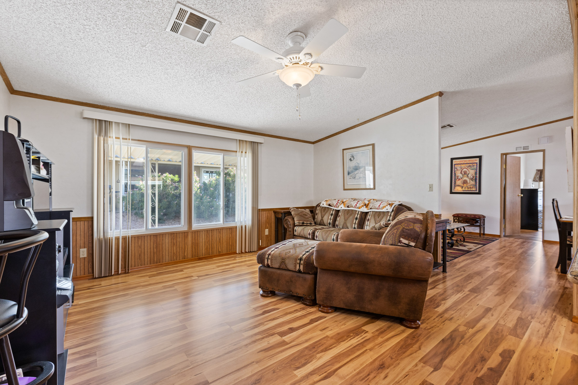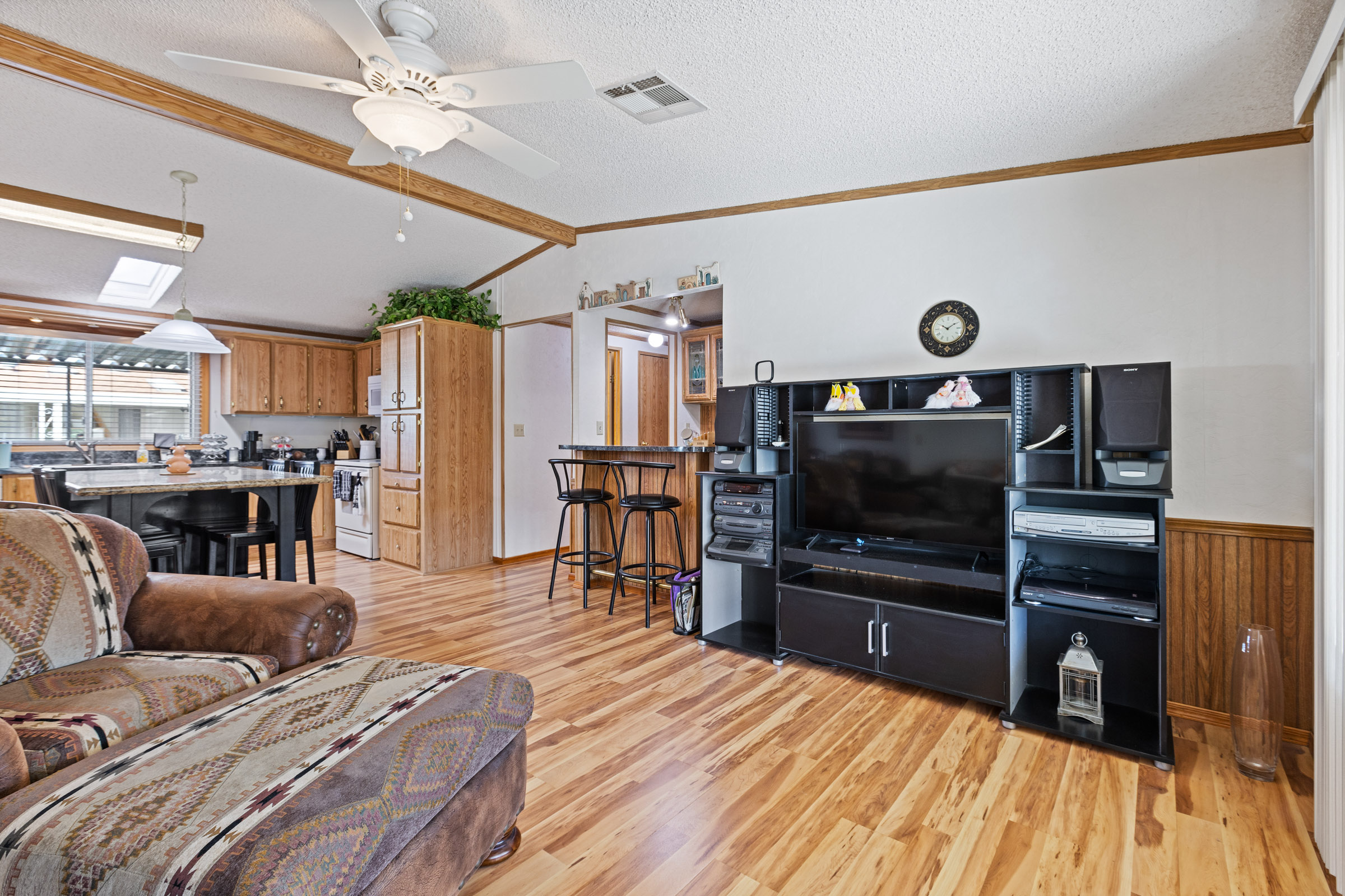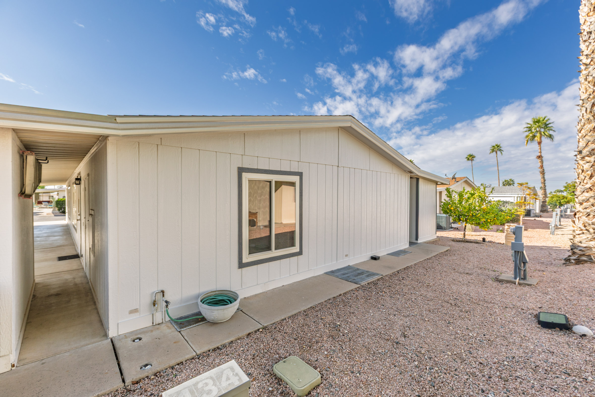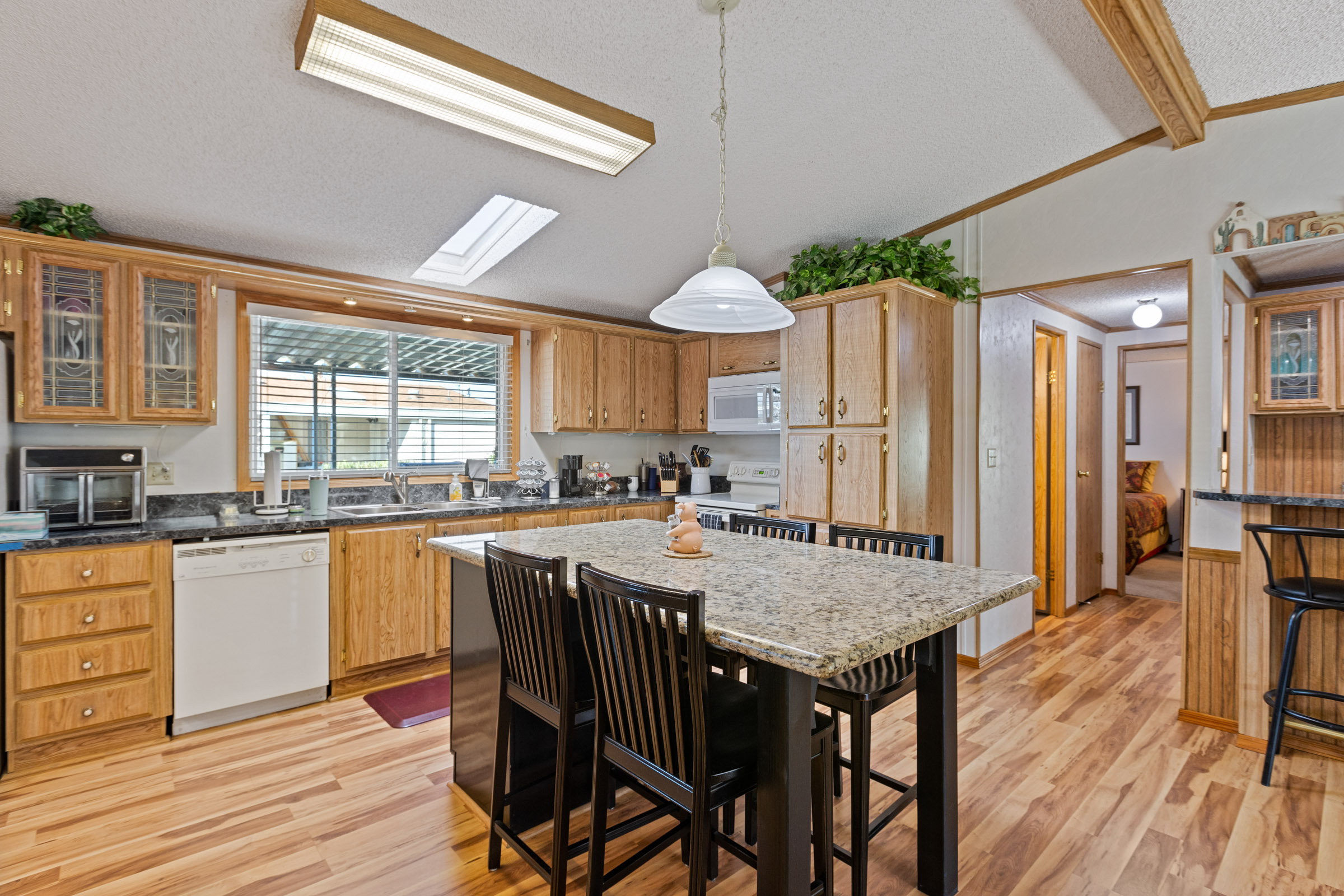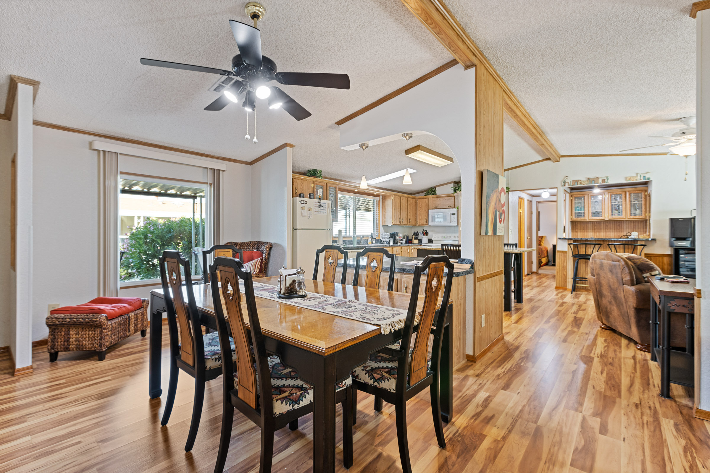 Beautifully maintained 3 bedroom, 2 bath home offers 1,664 sq ft of thoughtfully designed living space—fully furnished and truly move-in ready. Major updates include a new roof (2023), A/C (2022), and fresh exterior paint (2023). Inside, you’ll find laminate flooring throughout and dual pane windows that enhance both comfort and energy efficiency. The kitchen features a built-in island with granite countertop and breakfast bar, plus an additional bar off the dining room. The primary suite is a true retreat with dual sinks and a large tiled step-in shower accented by upgraded glass doors. The guest bath has also been updated with a stylish step-in shower. Outdoor you’ll find an epoxy-coated patio, two storage sheds, and a lemon tree. Call to schedule your personal tour today! (480) 325-1161
