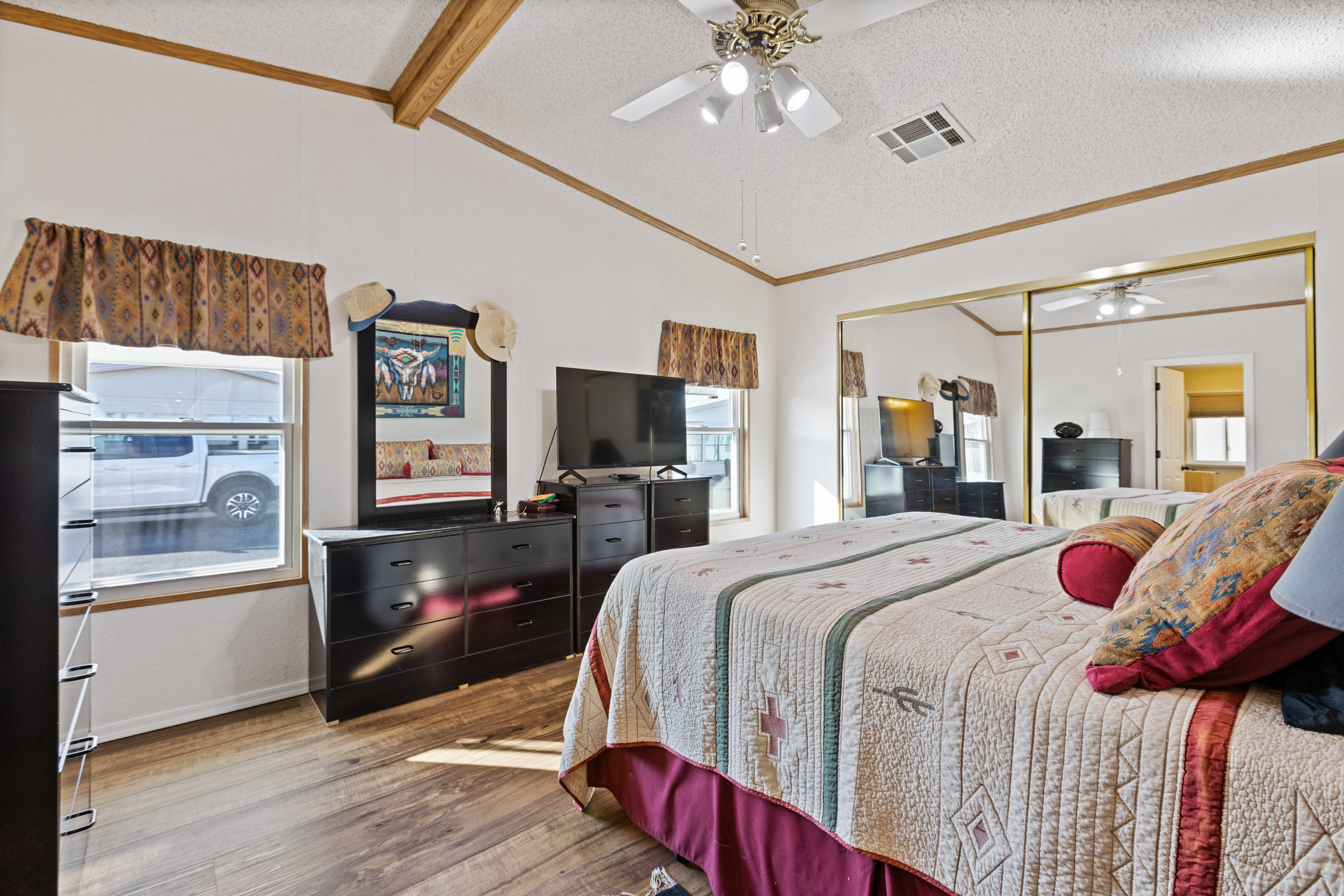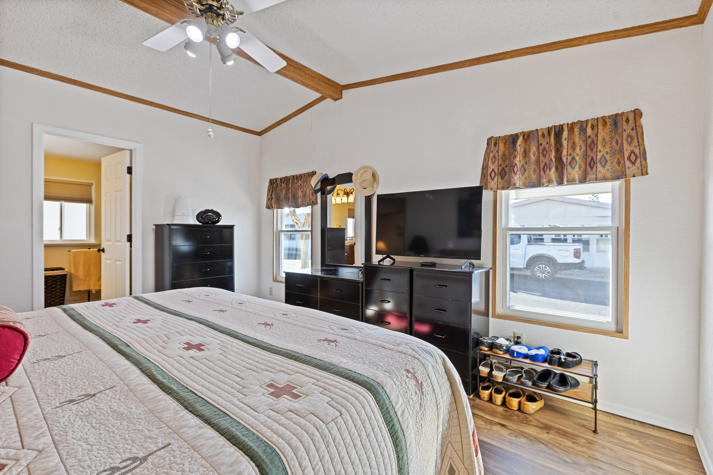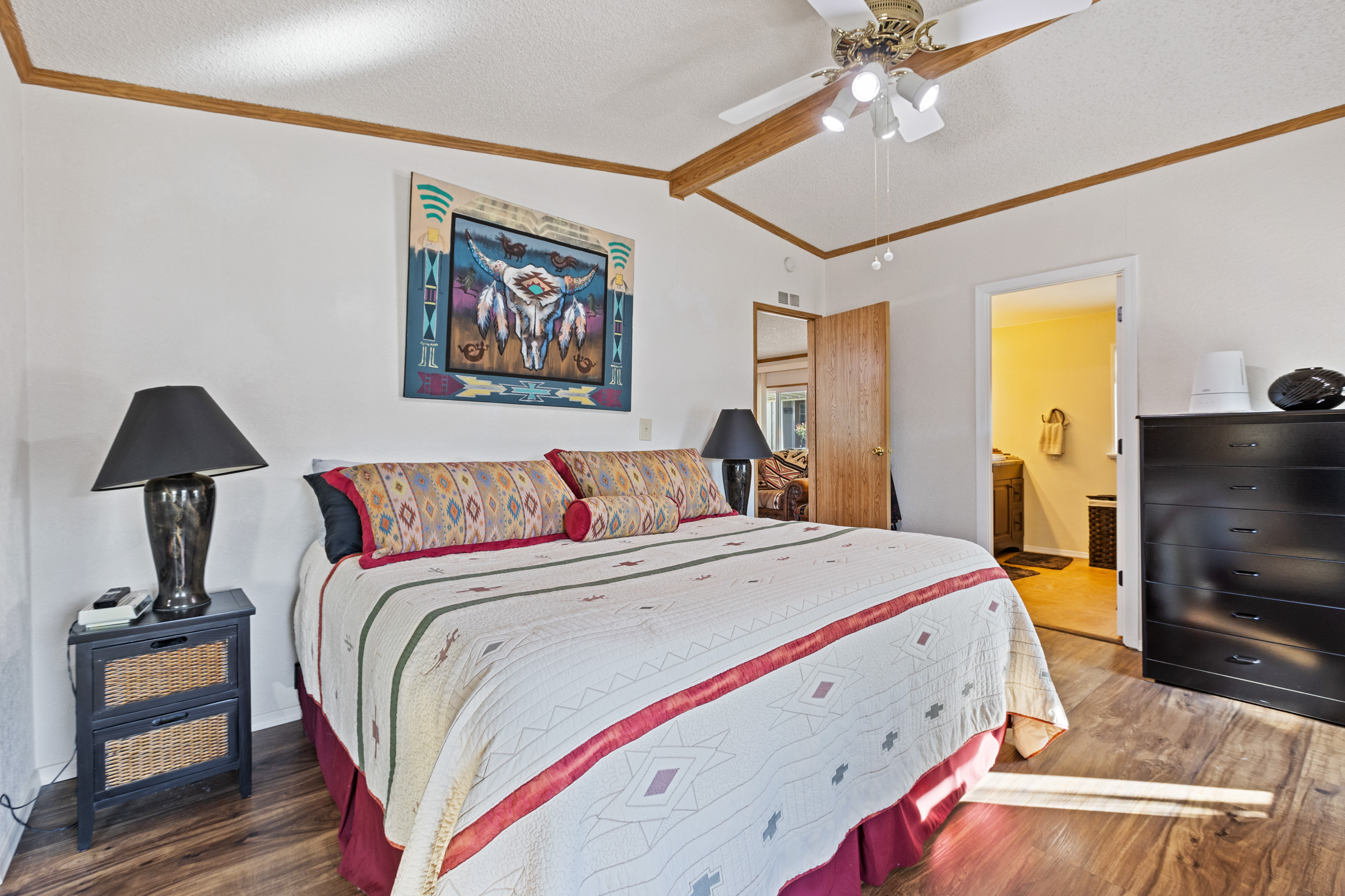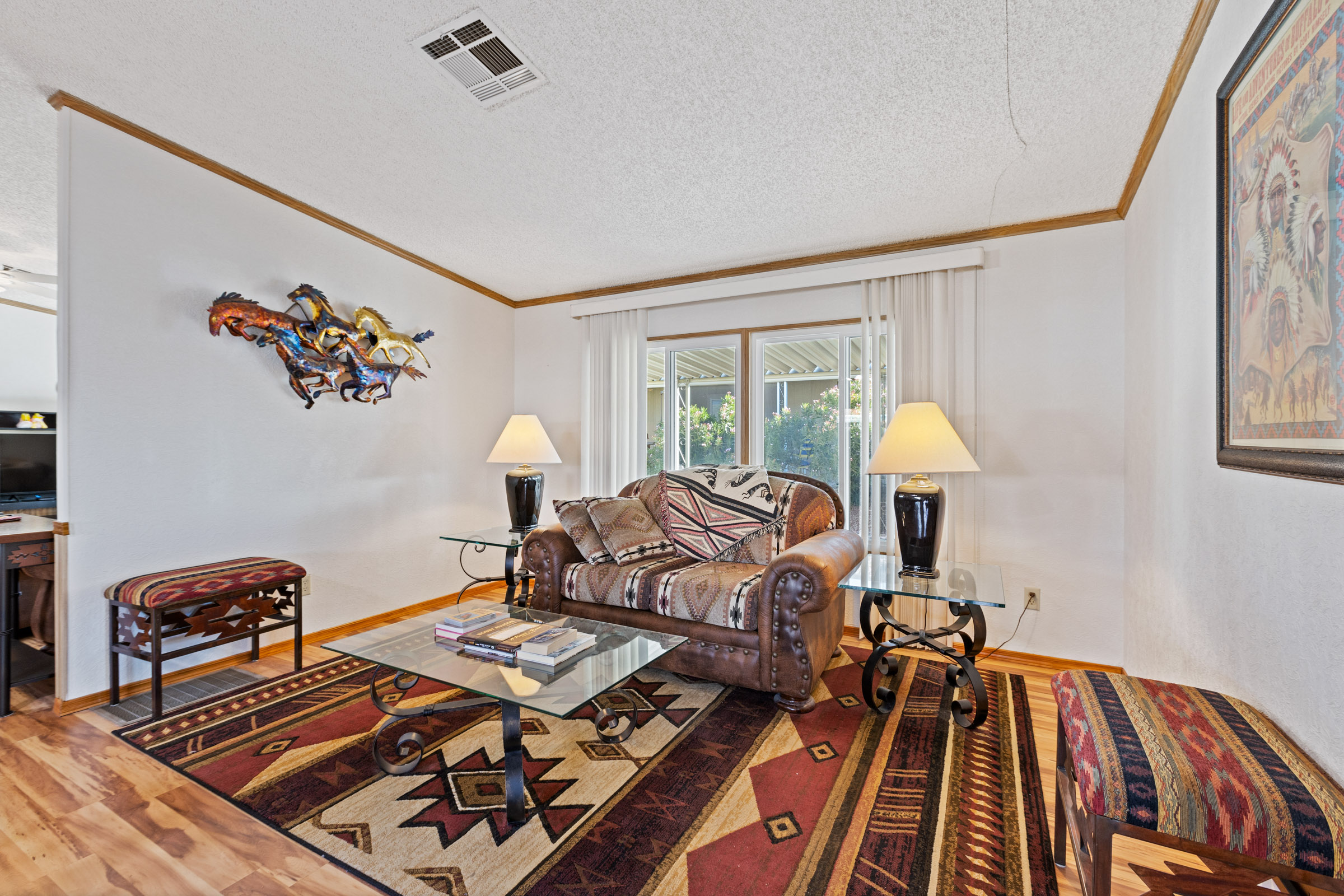 Beautifully maintained 3 bedroom, 2 bath home offers 1,664 sq ft of thoughtfully designed living space—fully furnished and truly move-in ready. Major updates include a new roof (2023), A/C (2022), and fresh exterior paint (2023). Inside, you’ll find laminate flooring throughout and dual pane windows that enhance both comfort and energy efficiency. The kitchen features a built-in island with granite countertop and breakfast bar, plus an additional bar off the dining room. The primary suite is a true retreat with dual sinks and a large tiled step-in shower accented by upgraded glass doors. The guest bath has also been updated with a stylish step-in shower. Outdoor you’ll find an epoxy-coated patio, two storage sheds, and a lemon tree. Call to schedule your personal tour today! (480) 325-1161