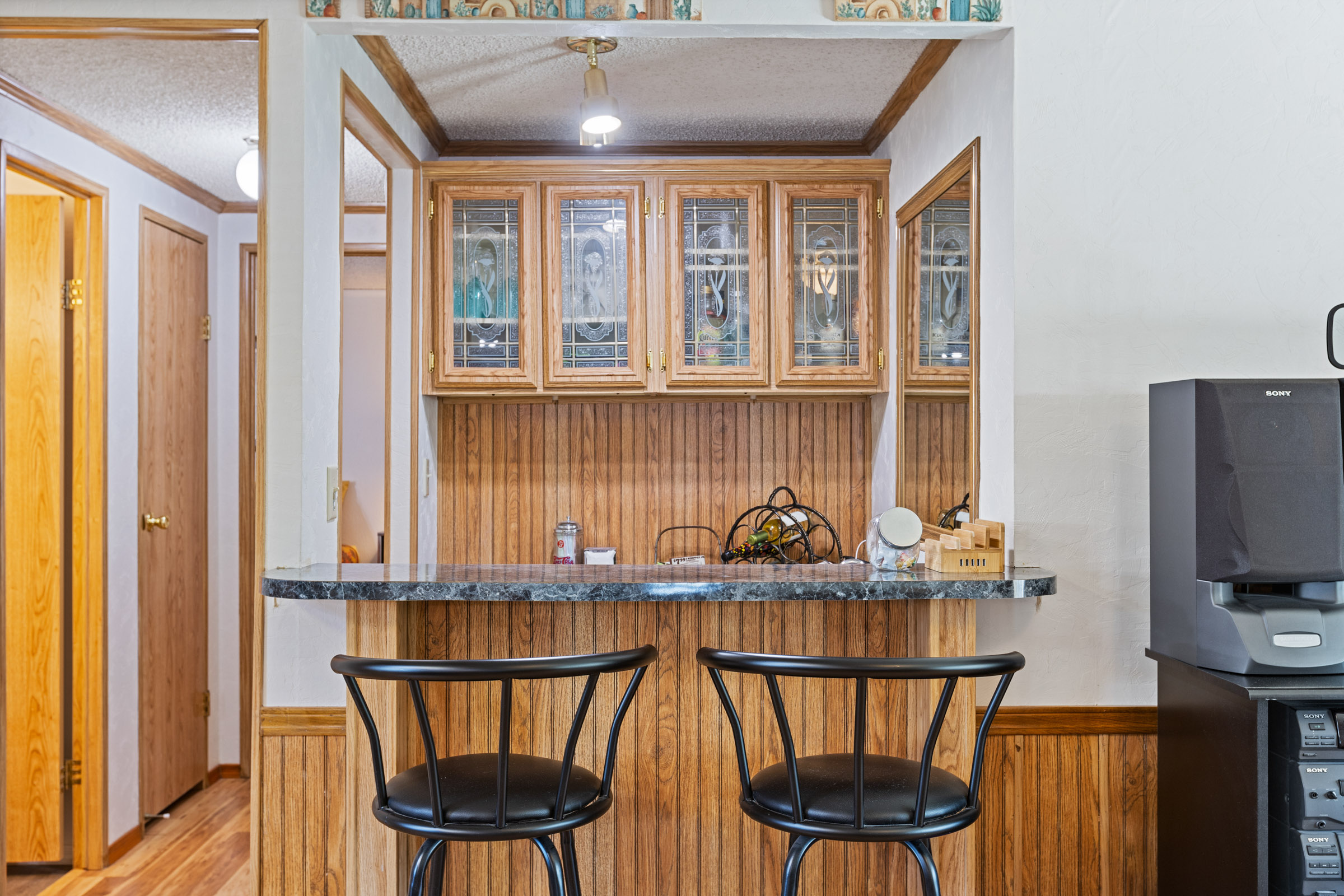 - Wood cabinet doors with molding throughout